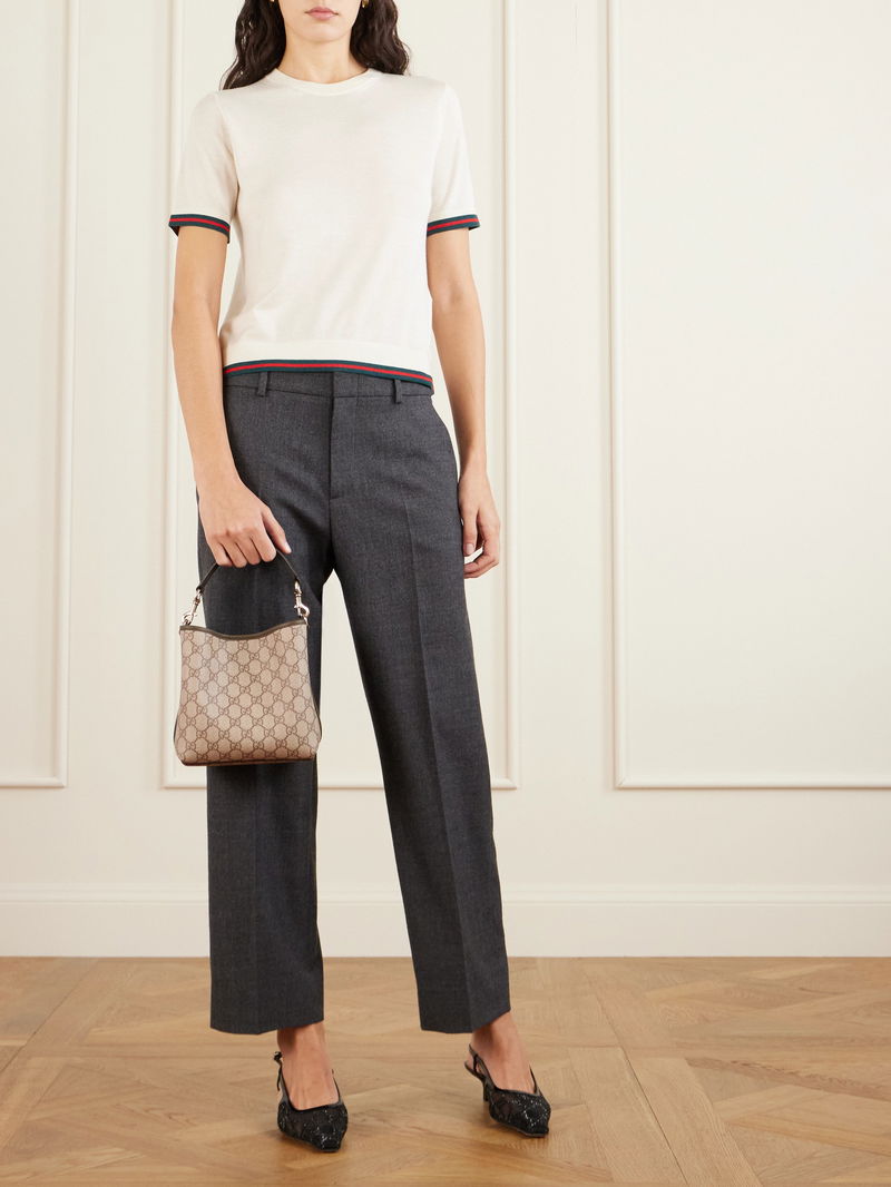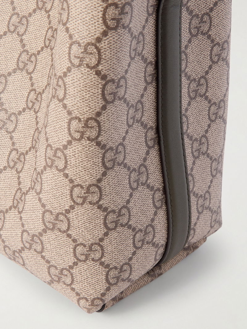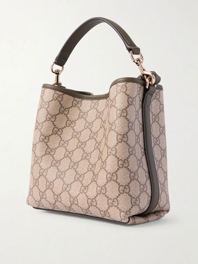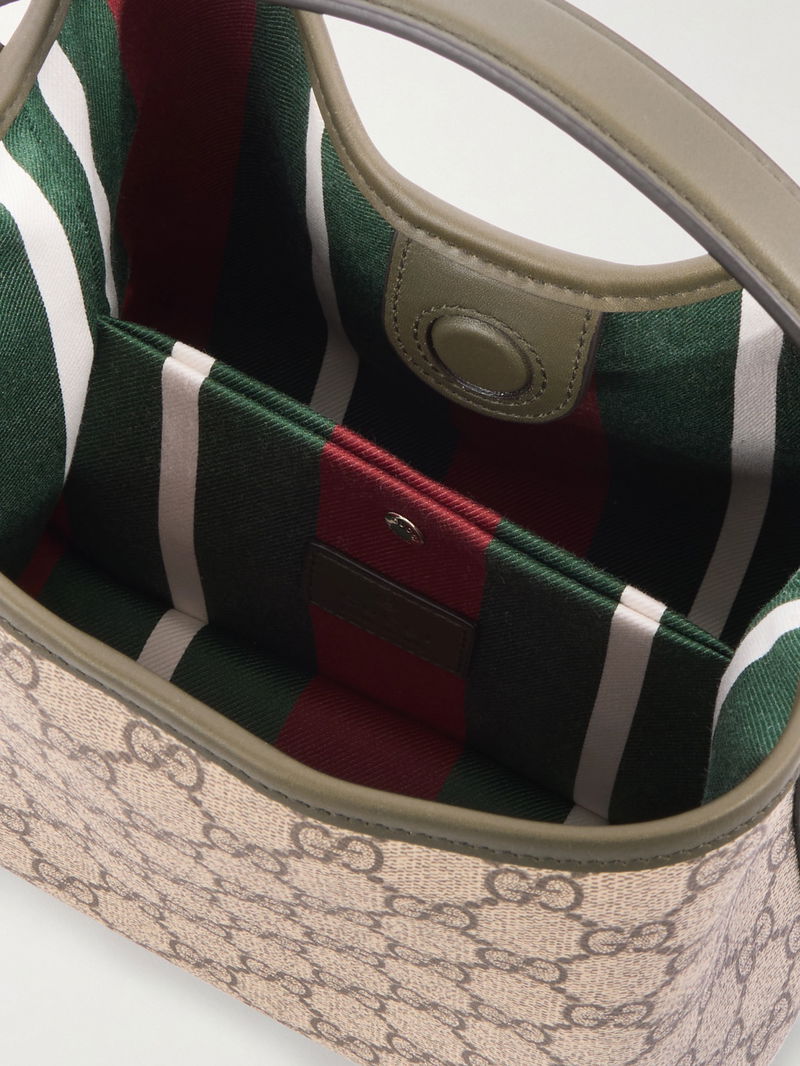Gucci's petite bucket bag is made from monogrammed coated-canvas and has leather trims and a striped twill lining.