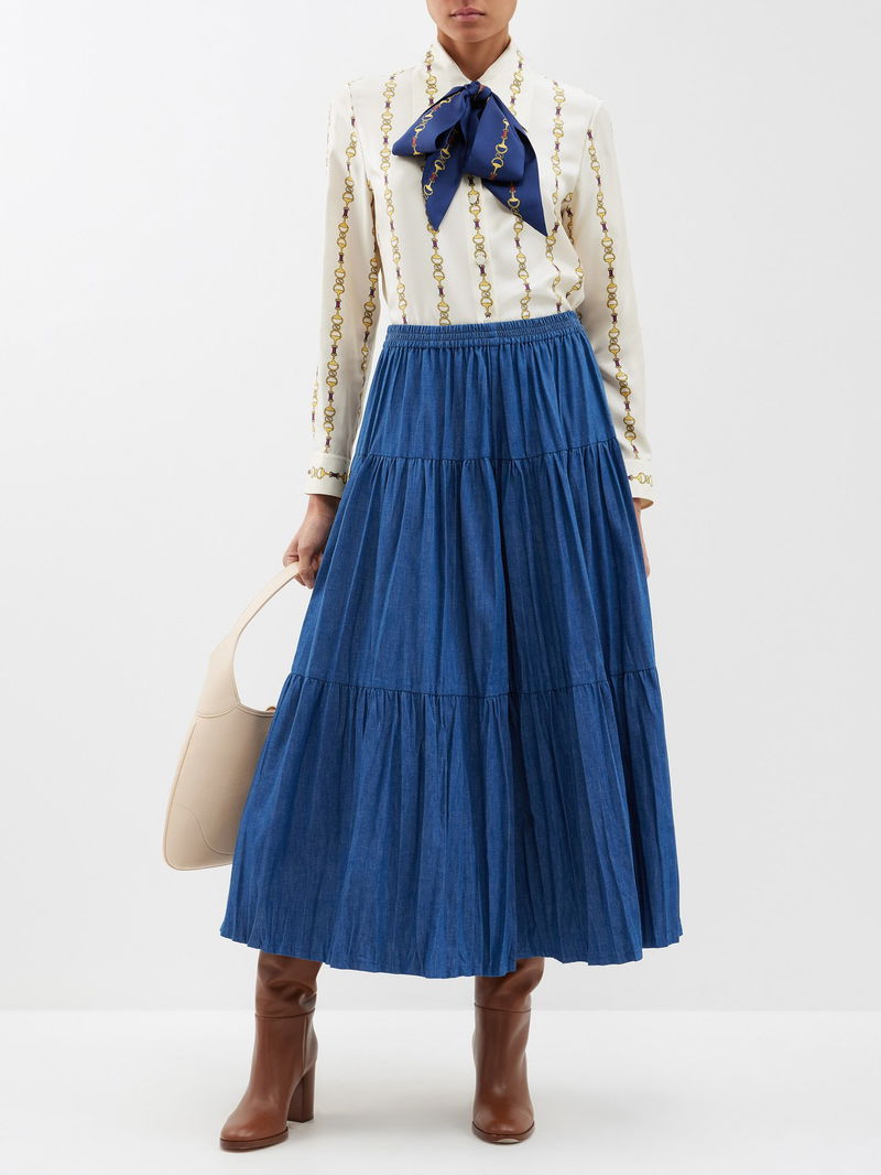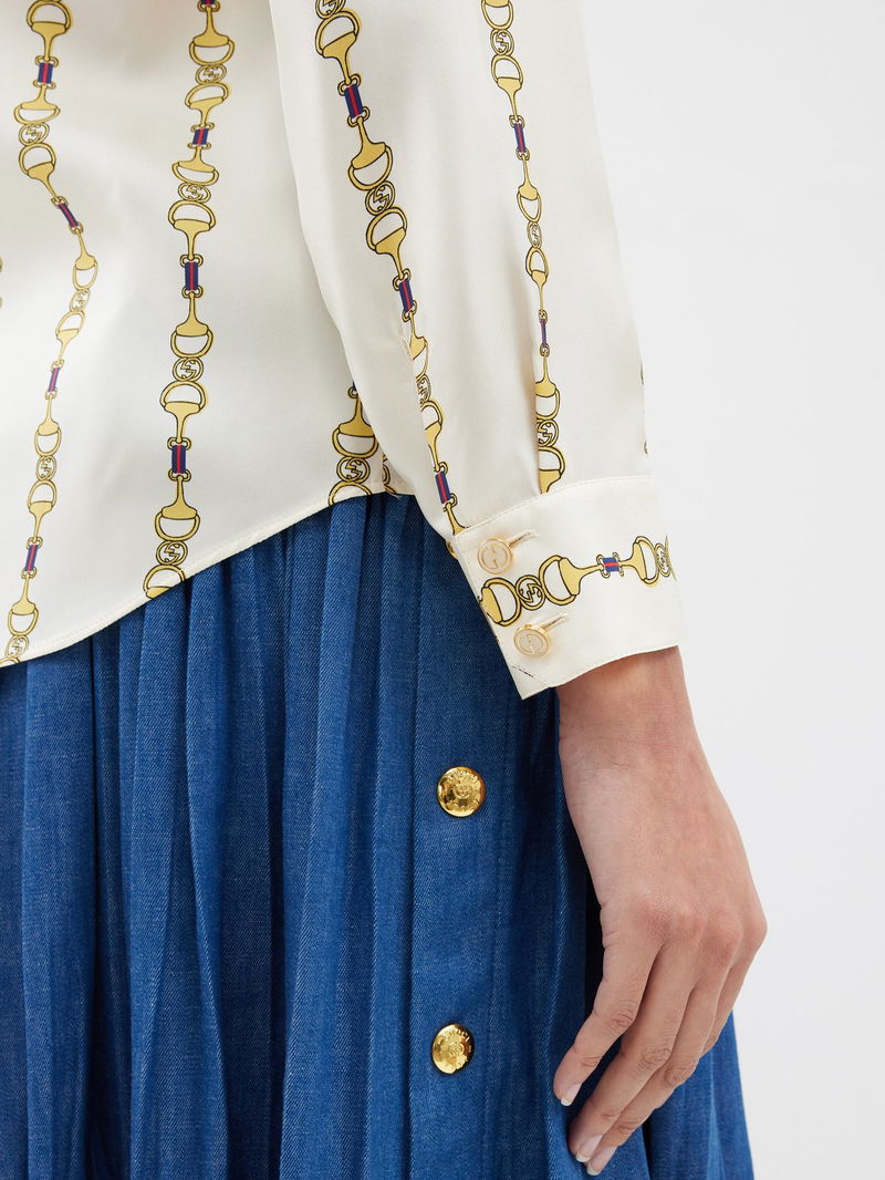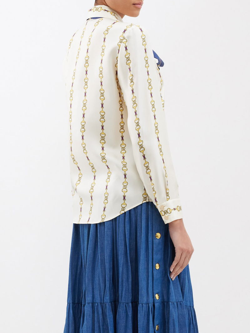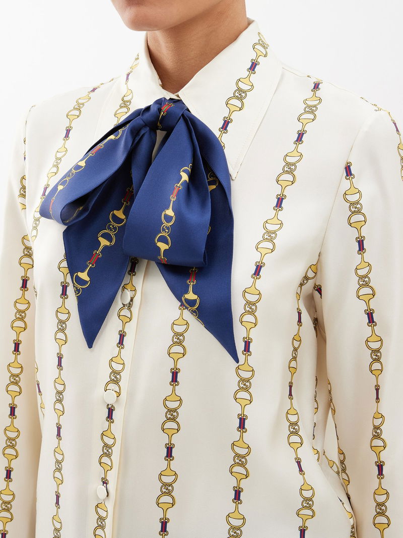 Gucci's ivory shirt is made from fluid silk satin with a voluminous pussybow tie and the house's archival Horsebit motif arranged in vertical stripes.