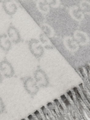 Firstly introduced in the 70's, this scarf features Gucci's GG jacquard pattern all over. The style is crafted from pure wool in a blue and grey hue and features fringed edges .