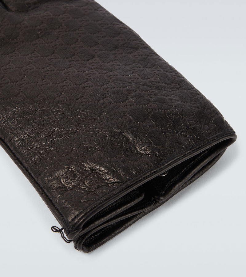 These gloves from Gucci are crafted from soft leather, showcasing the signature GG logo in embossed detail throughout. The pair feature a smooth cashmere lining and snap buttons for a secure fit.