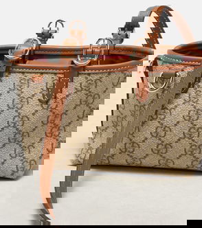 Gucci bag charms adorn your favorite accessories with their playful, colored forms. Crafted from coated canvas with a leather trim, this butterfly-shaped piece is detailed with the signature GG motif and finished with a golden chain.