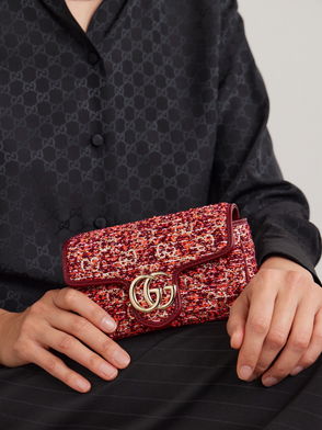 Gucci updates its signature 'GG Marmont 2.0' bag with this chic bouclé version. Crafted in Italy, it has a classic quilted finish and features the label's interlocking motif in light-blue. The leather trims outline the shape nicely, while the faille-lined interior offers enough space for your phone, cardholder and keys.
