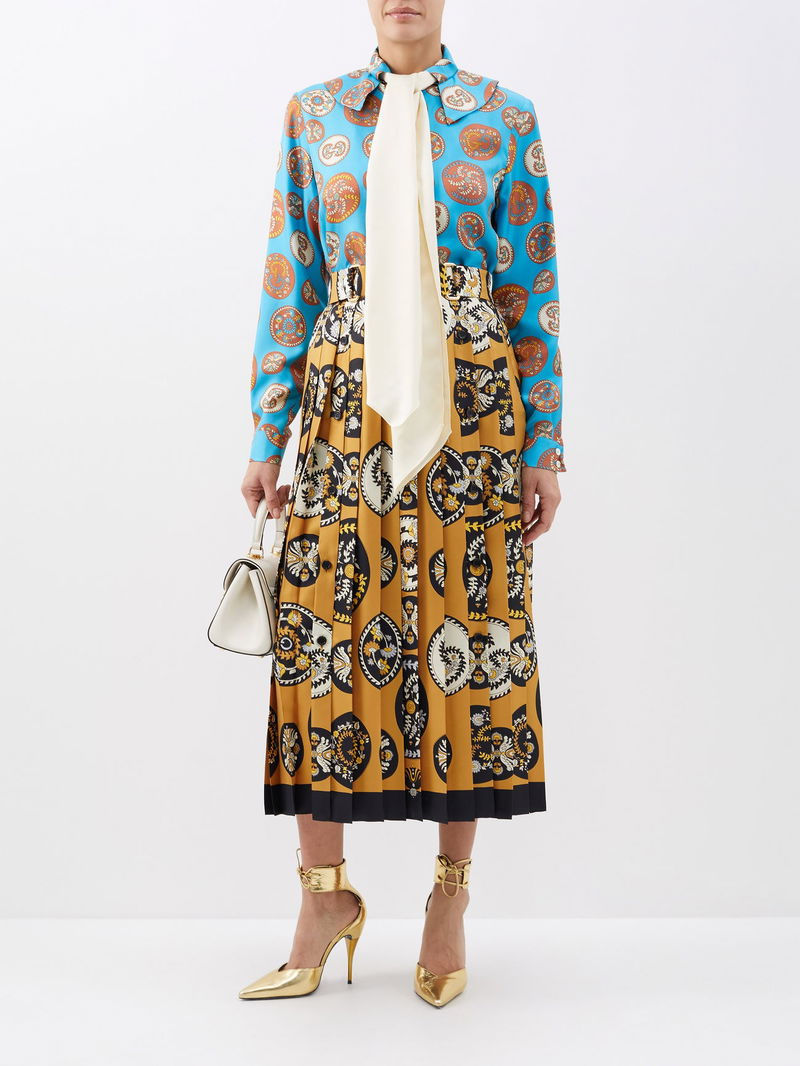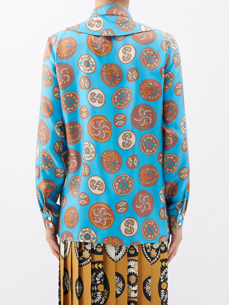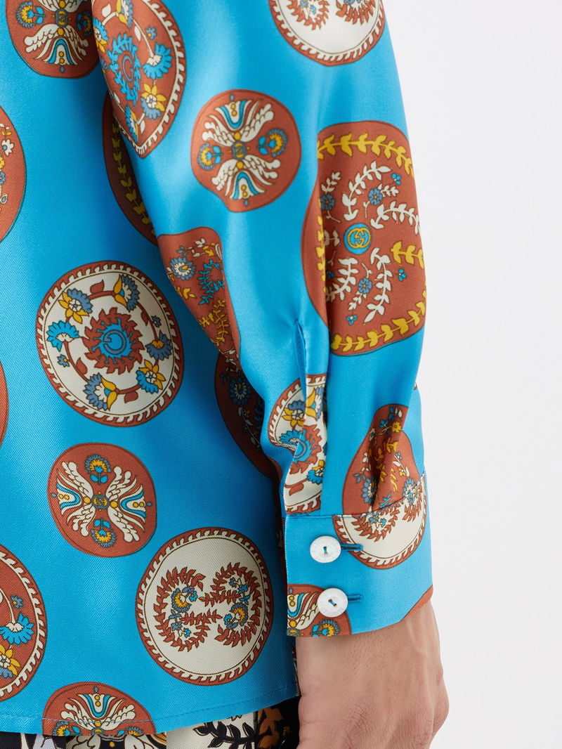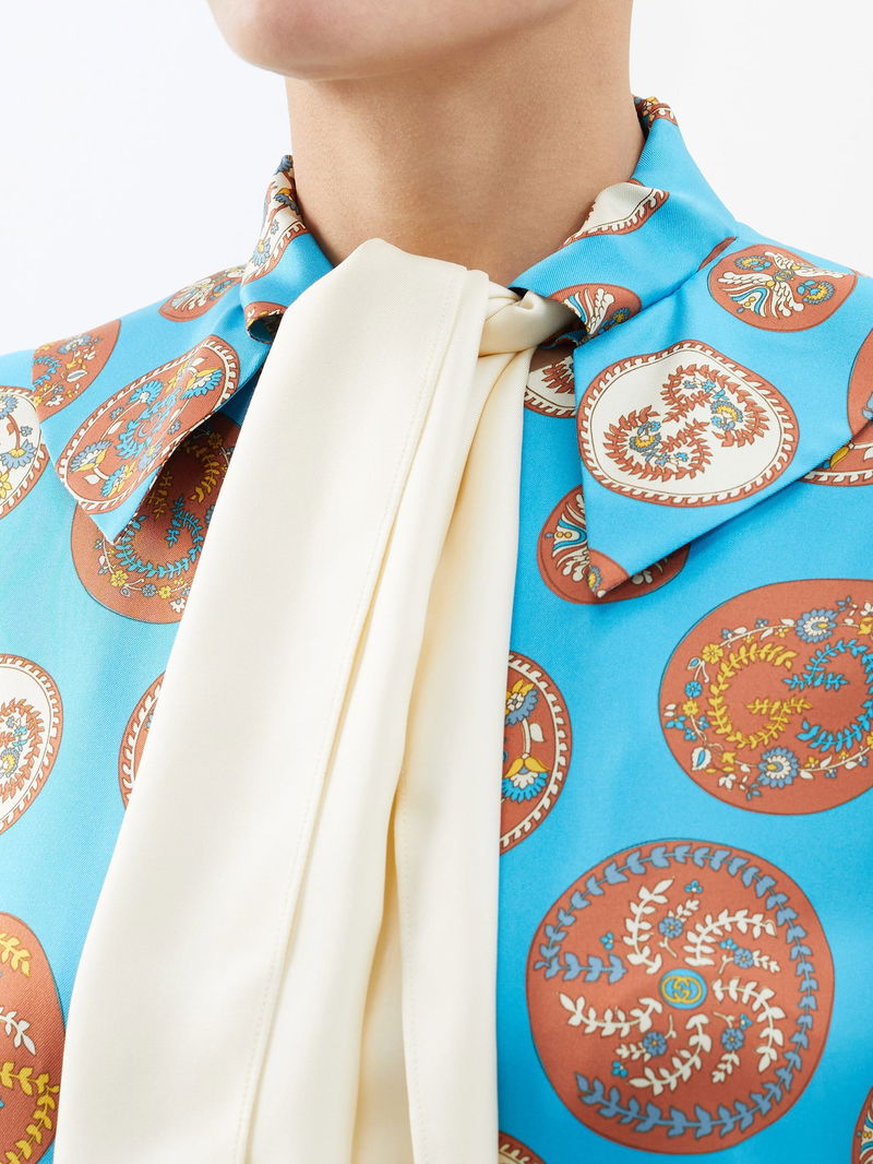 Gucci commemorates the Year of the Rabbit for the 2023 Lunar New Year with this blue shirt, crafted in Italy from paisley-print silk crepe with a smart point collar tempered by an ivory scarf detail.