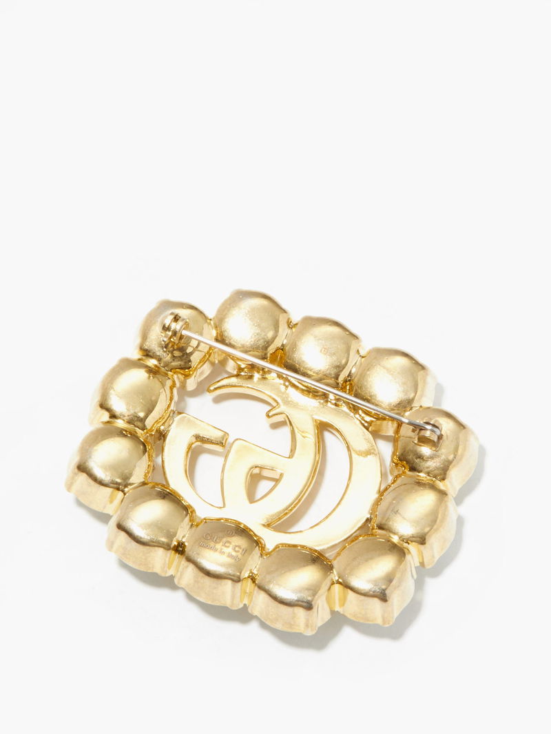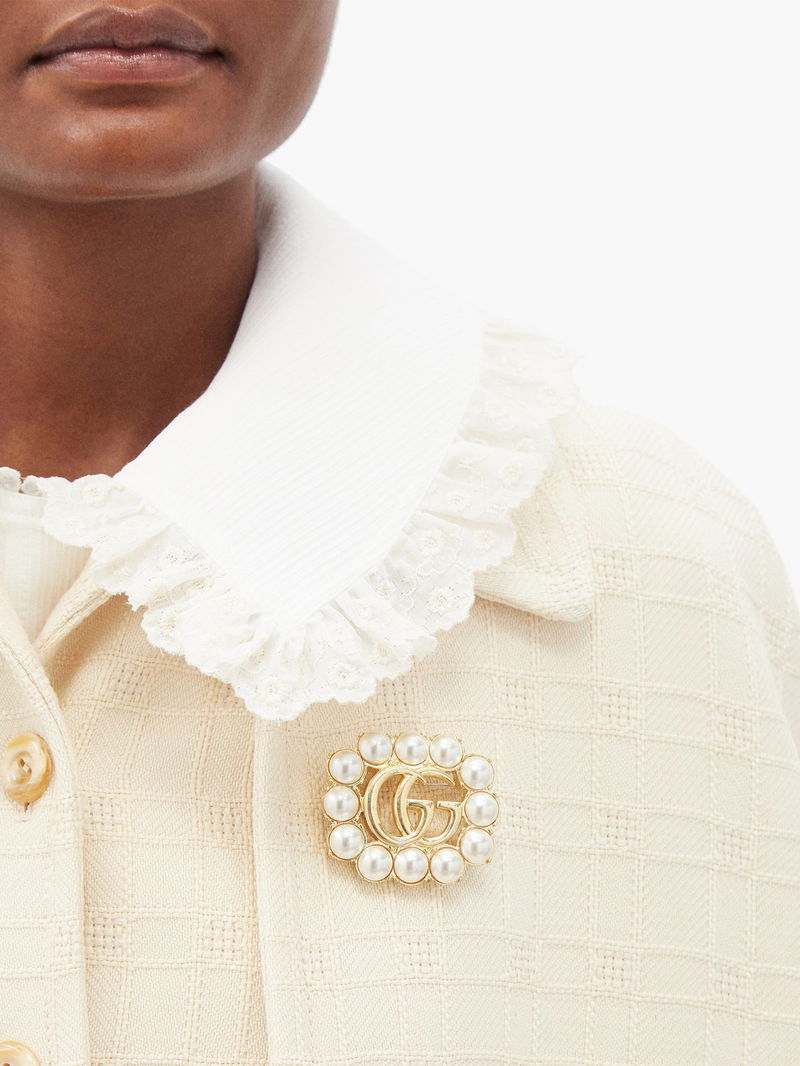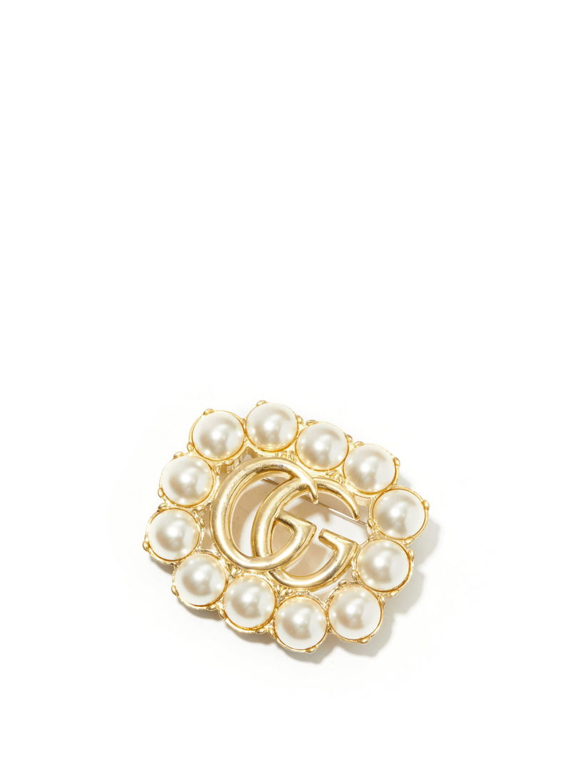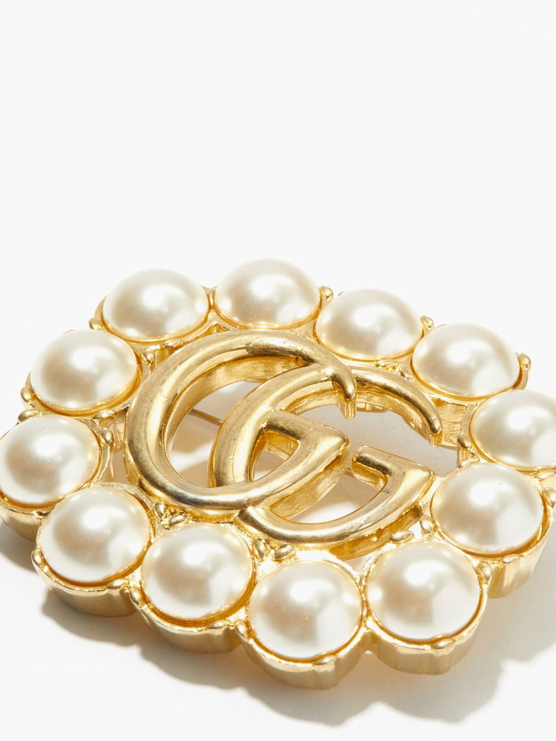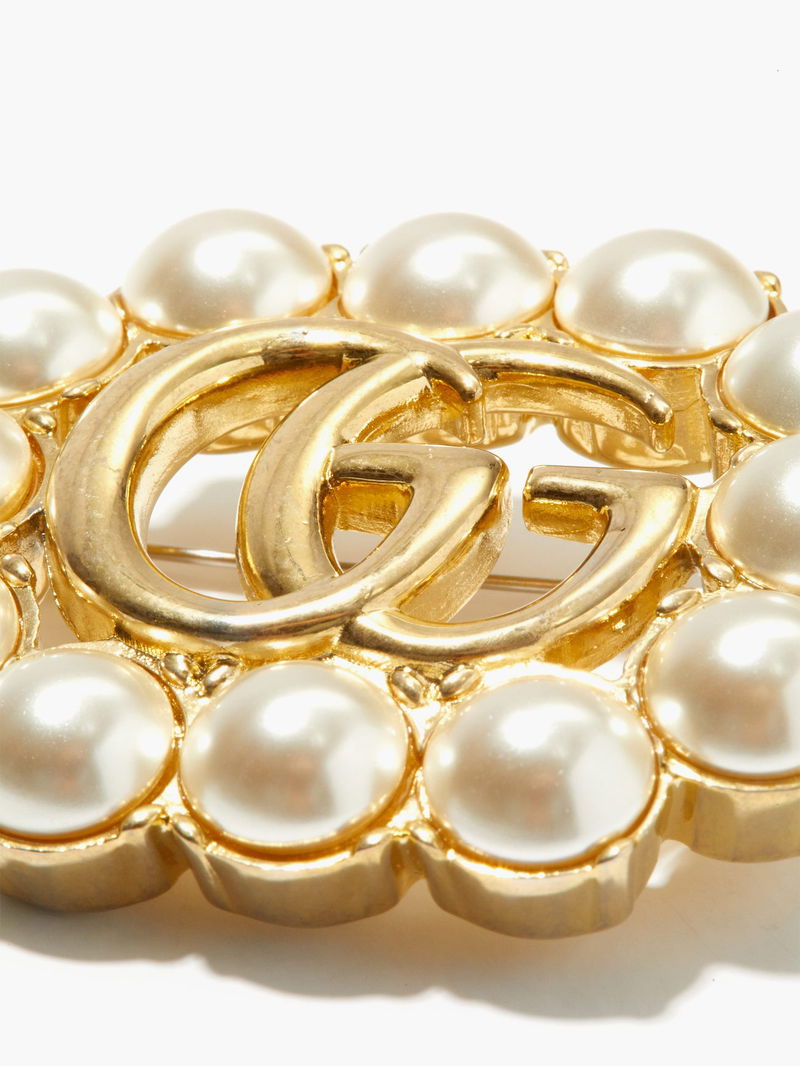 Cite Gucci creative director Alessandro Michele's more-is-more aesthetic with this gold-tone metal brooch, which echoes the opulence of classic Rococo pieces. It's crafted in Italy with a central GG, a motif that traces back to the 1930s, which is framed by smooth faux pearls. Attach it to a blazer or jacket for a ladylike appearance.