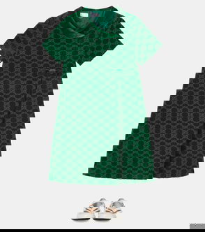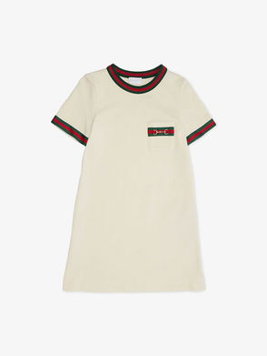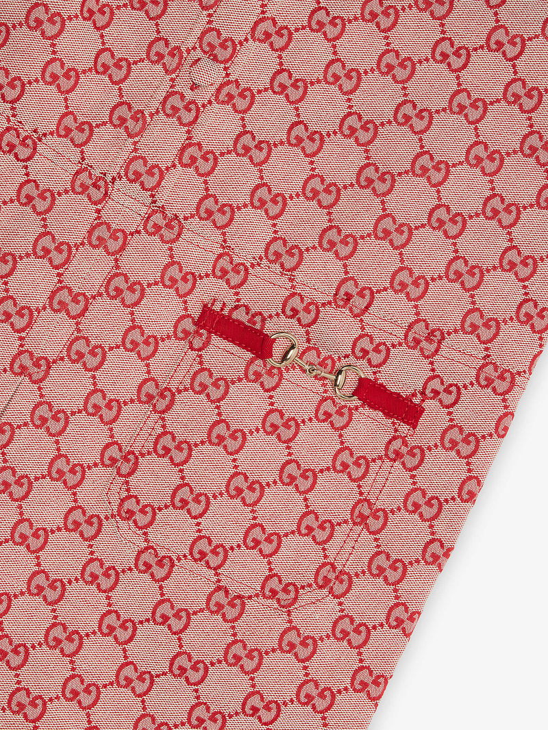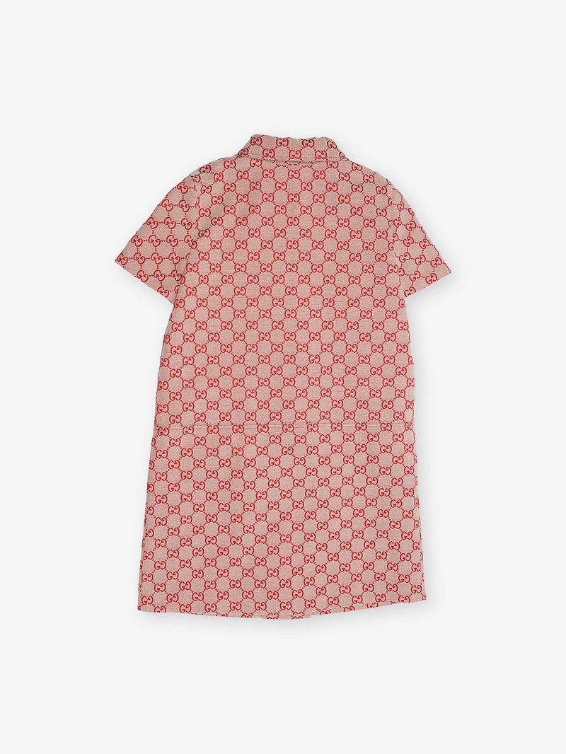 Gucci canvas dress. Exposed button fastening at front. Pointed collar, short sleeves, two patch pockets at front with horsebit detailing, all-over monogram print.