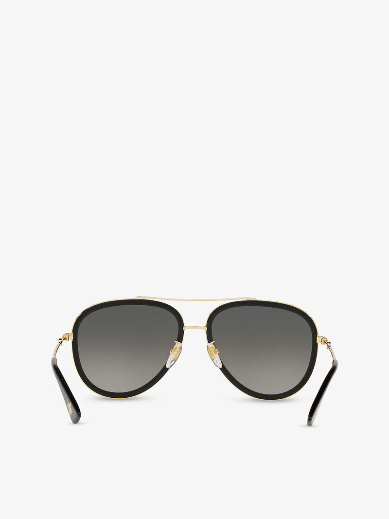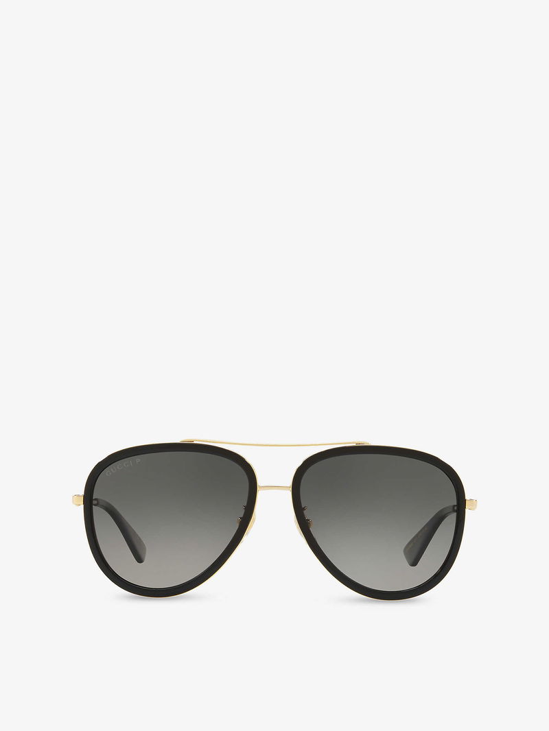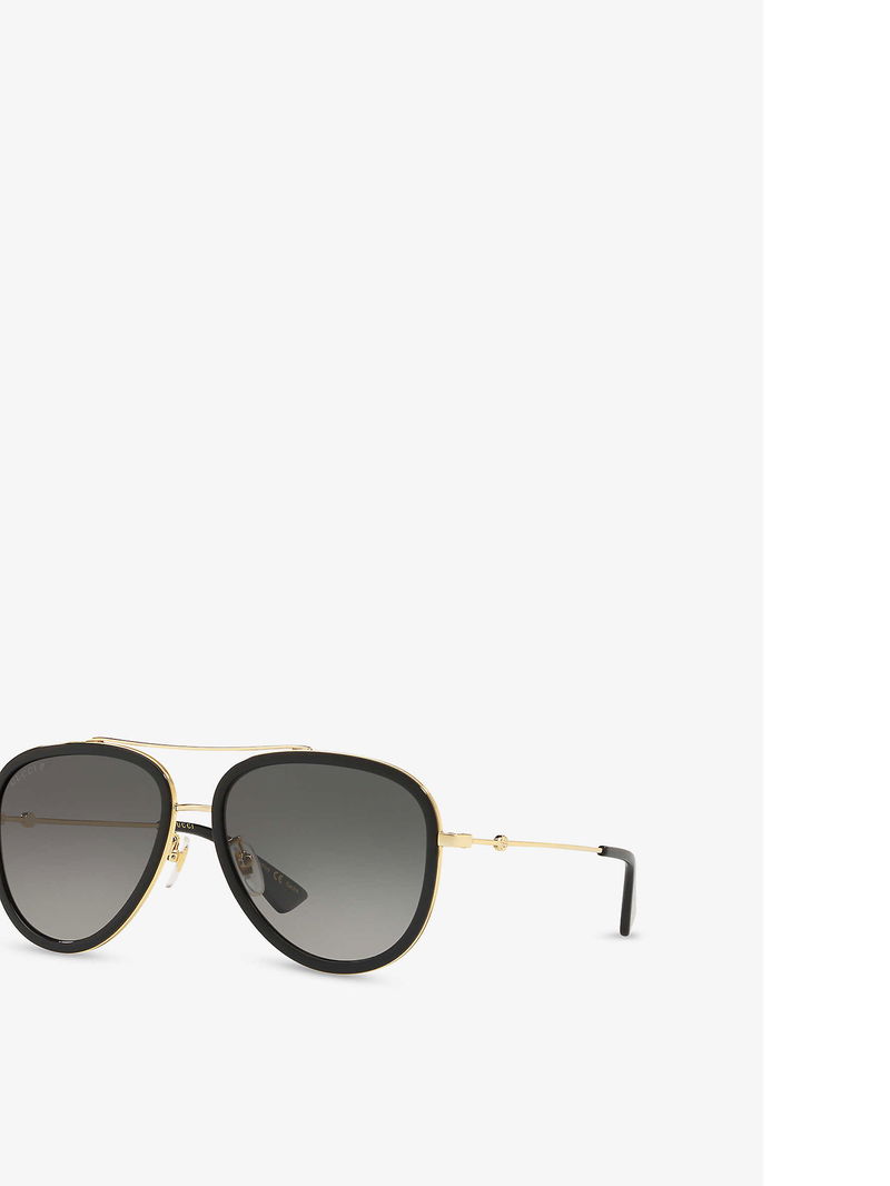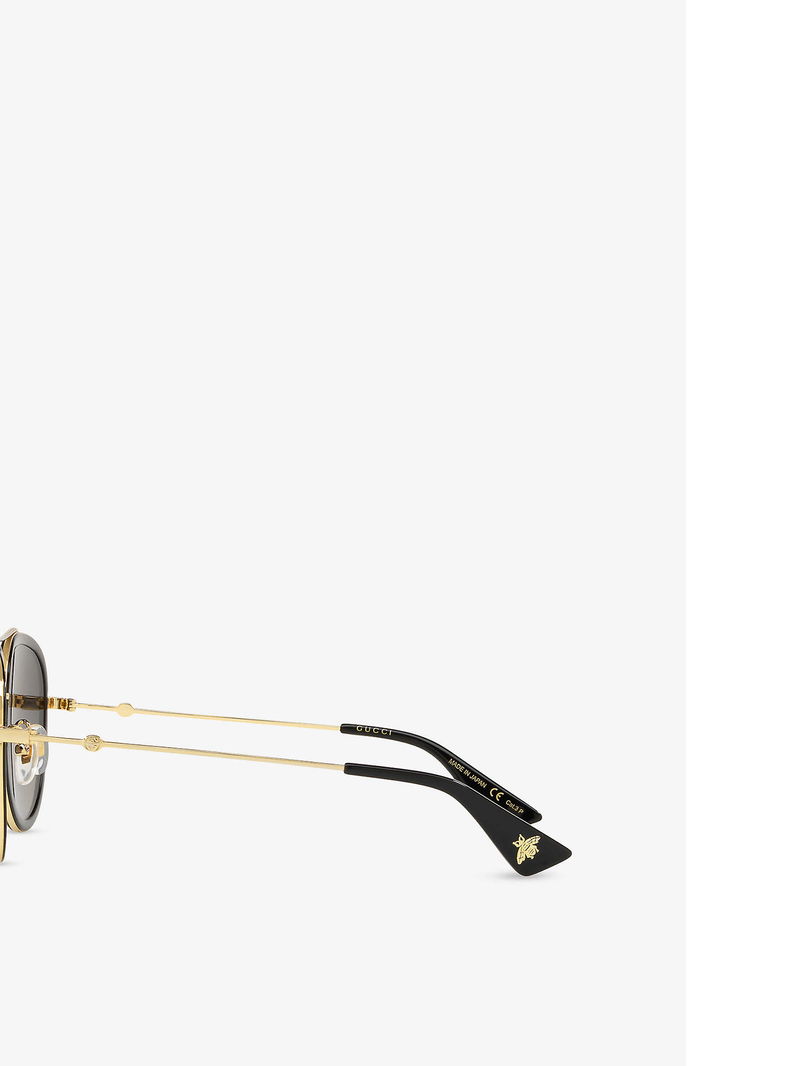 Selfridges Says:"Using the unlikely tale of Frankenstein as its muse for Gucci's AW18 collection, Alessandro Michele's splicing and reworking of house codes were imbued with a fresh level of modernity. Cut to a classic pilot frame, the Gg0062s sunglasses are fitted with tinted lenses and a slim top bar, paying tribute to the label's 'Garden' theme with their gold-toned bee motifs at the tips.