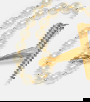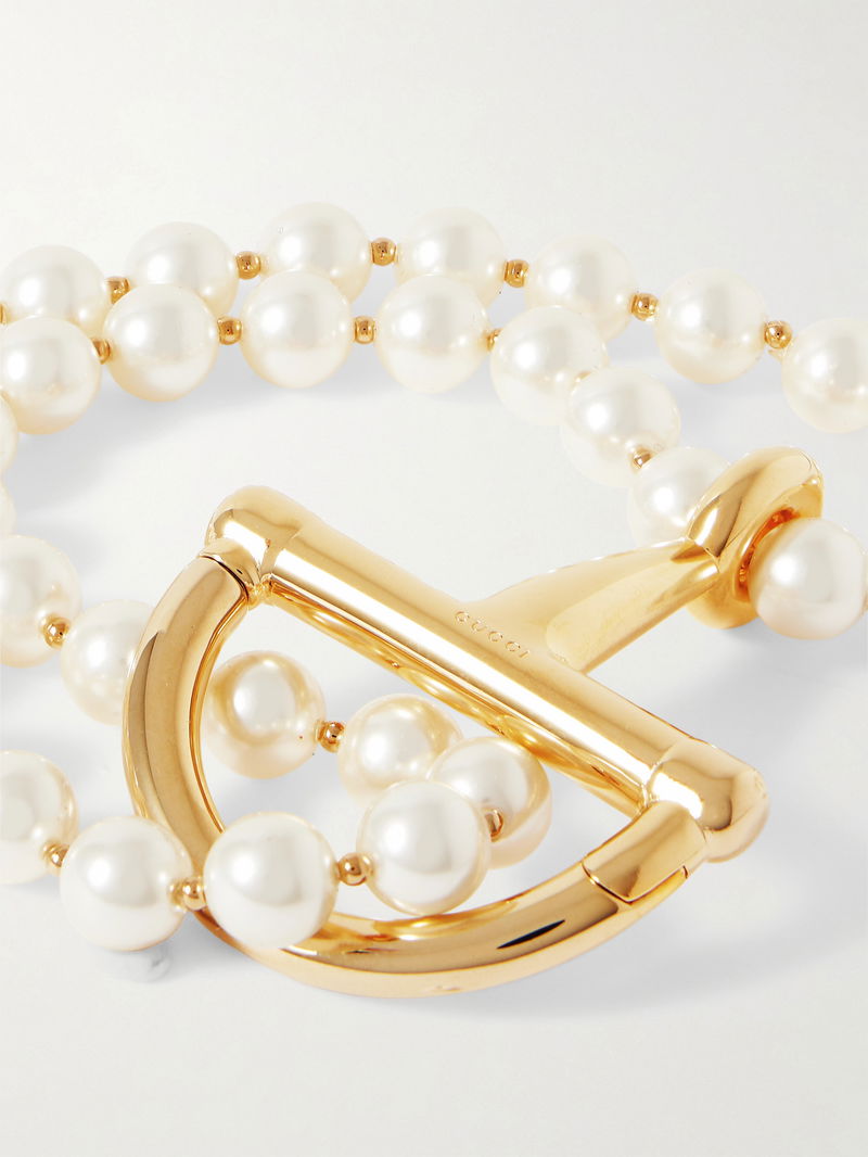 Gucci has halved its emblematic horsebit for the season, which makes a sizable statement on this bracelet. It's made from gold-tone metal and strung with lustrous faux pearls to layer around your wrist.