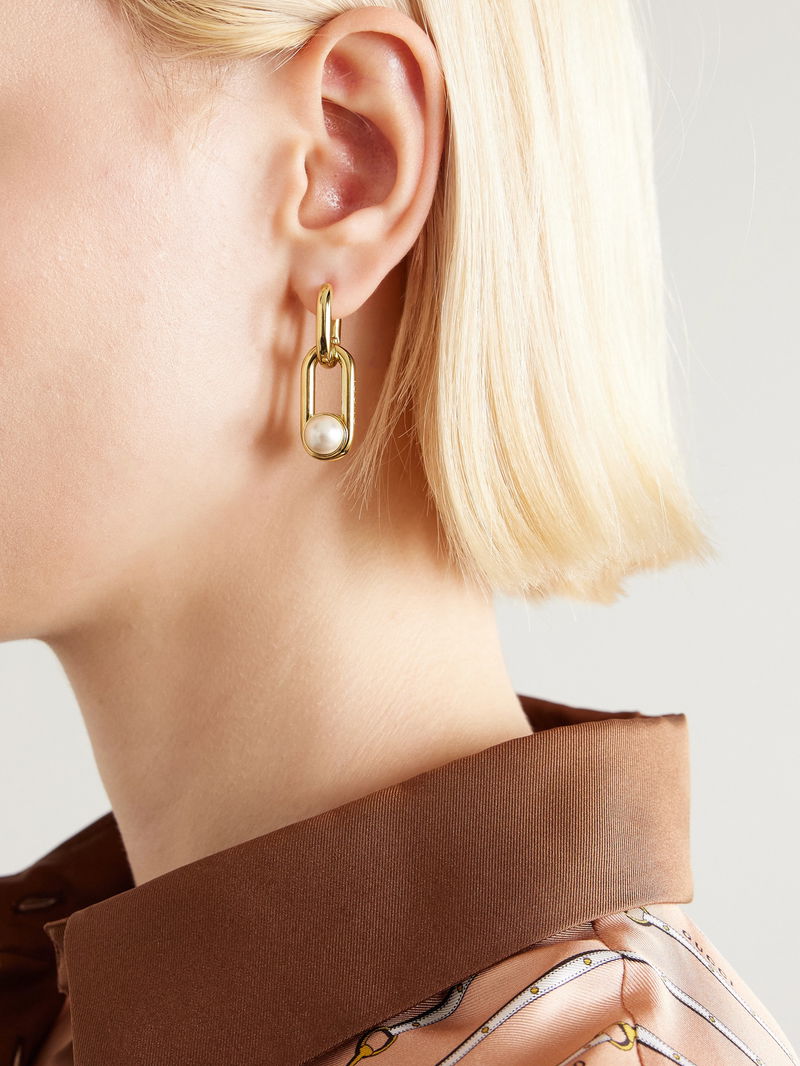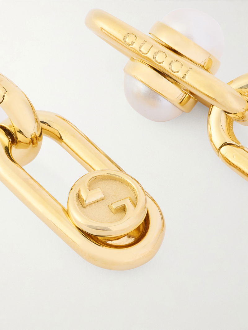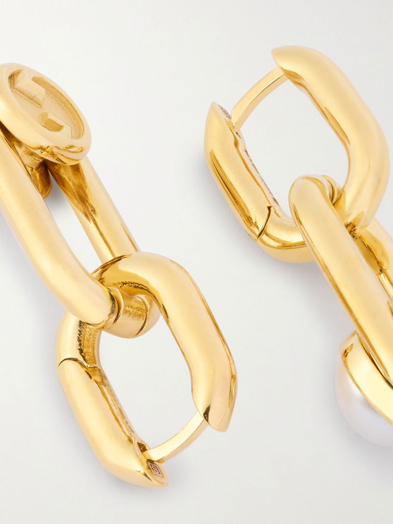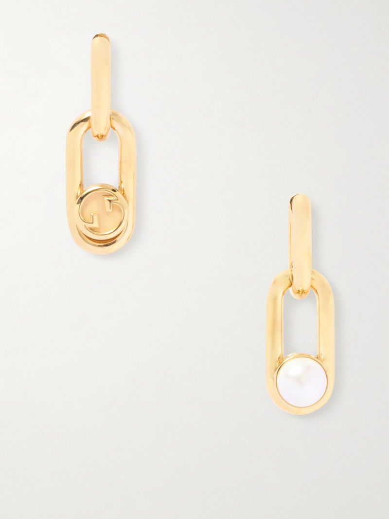 Gucci's earrings draw inspiration from industrial hardware. Made from gold-tone metal, they have an asymmetric design—one side set with a faux pearl, the other engraved with the iconic interlocking ‘GG’ logo.