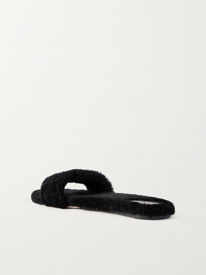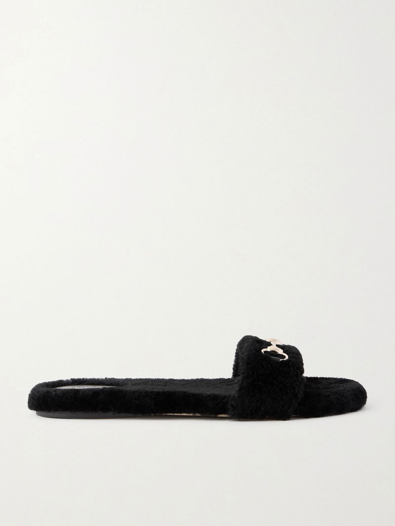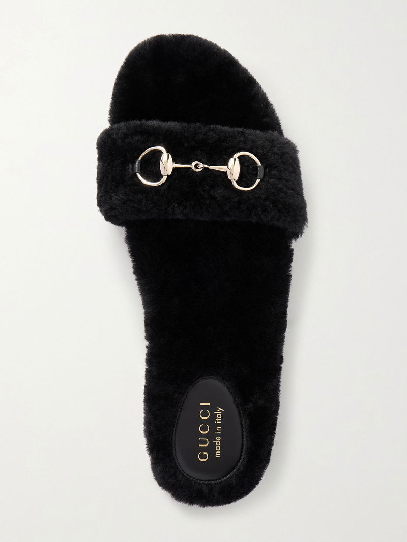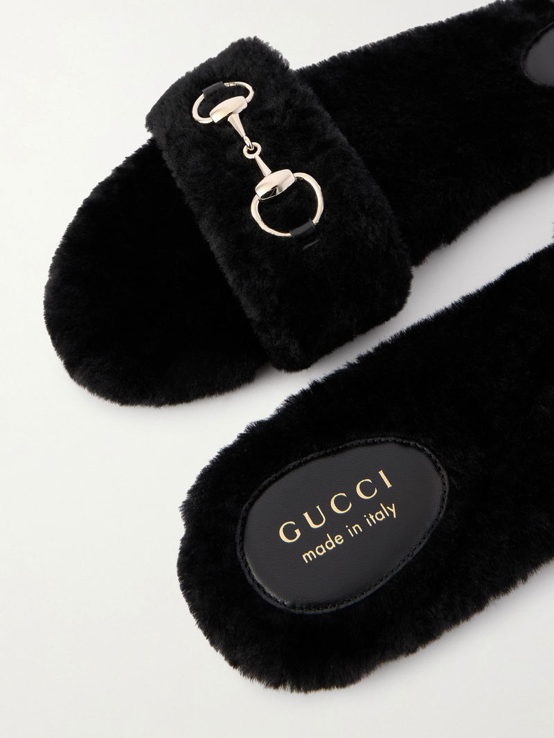 Gucci's slides have been made in Italy from black shearling that feels so soft and cozy. They have slim soles and signature horsebit hardware.