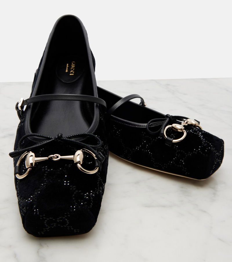 Made for special evenings, the Gucci Horsebit ballet flats from Gucci are crafted from plush velvet and leather trims. The pair showcases some of the house's most iconic codes, including GG Crystal embellishments and Horsebit hardware.