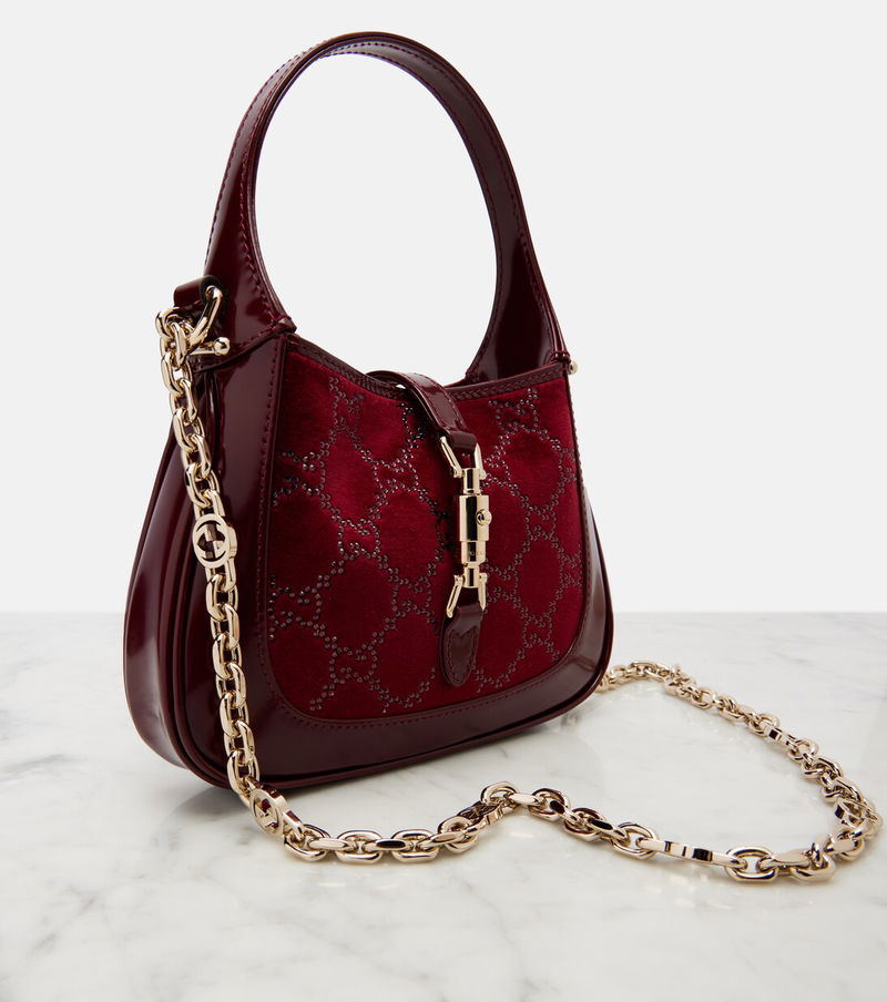 Made for special evenings, the Jackie from Gucci is a curved tote bag crafted from plush velvet and patent leather. The design showcases some of the house's most iconic codes, including GG Crystal embellishments and a piston fastening.