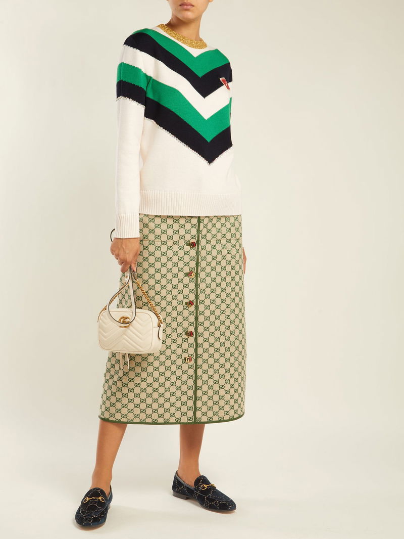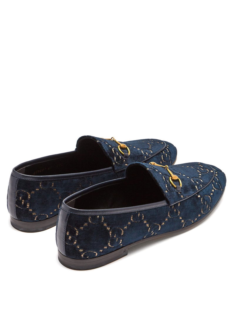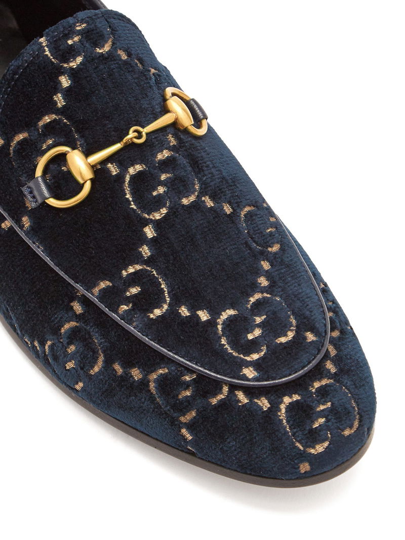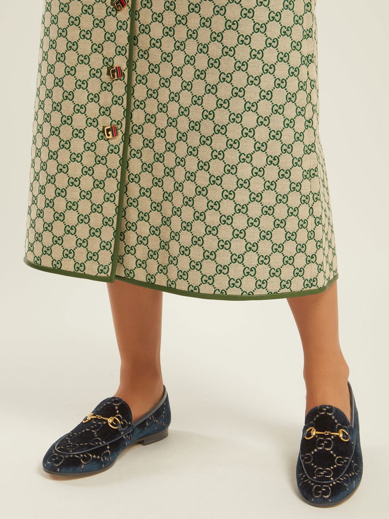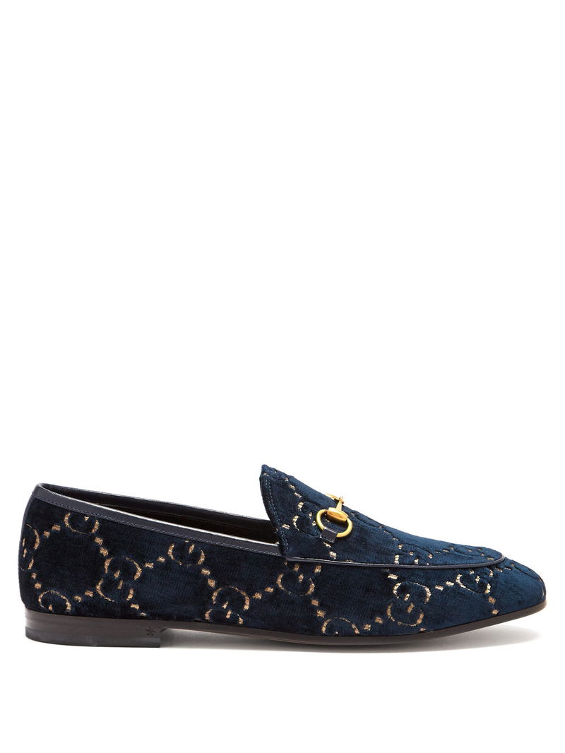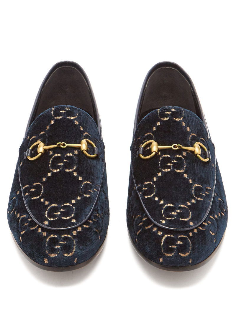 Gucci reworks its coveted Jordaan loafers with a blue velvet iteration of it hallmark GG print for Pre-AW18. They're made in Italy with a small stacked heel and the house's gold-tone metal Horsebit plaque across the front, then lined with black leather along the top edge. Style them as the ending note to a graphic sweater and skirt for a casual lunch date.