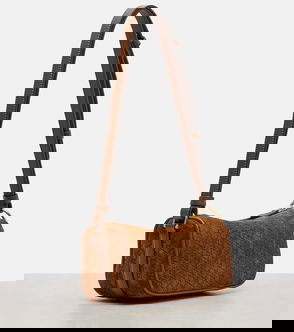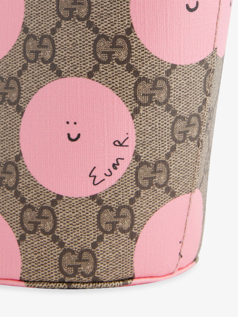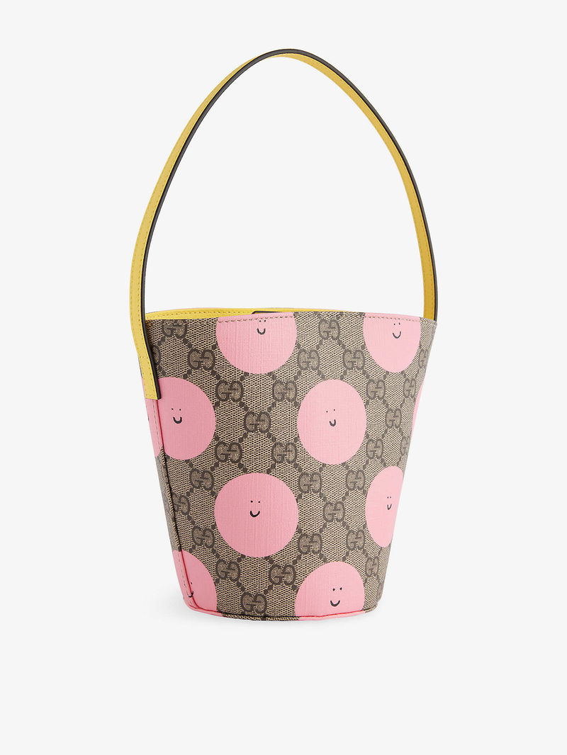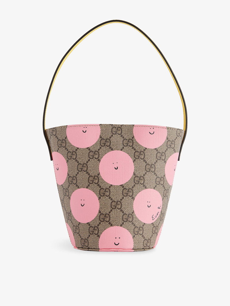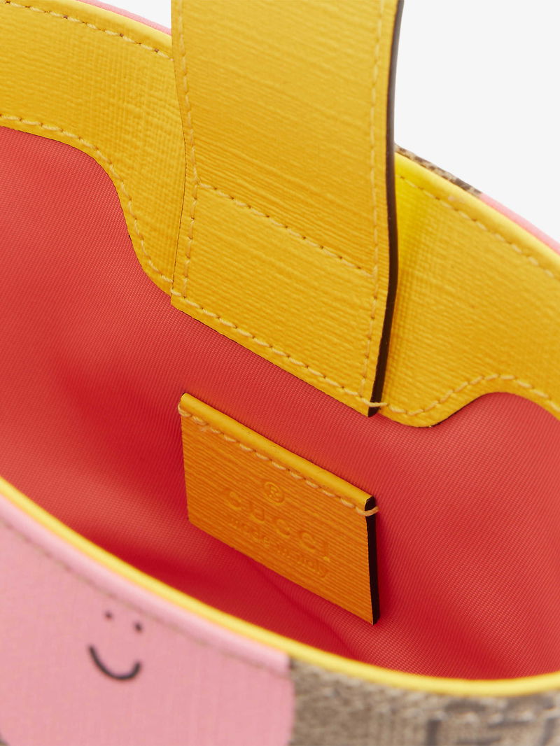 Gucci canvas top handle bag. Bucket shape, top handle, all-over smiling sun print, all-over monogram print, canvas texture, contrast leather trims, silver-toned hardware, one main compartment, internal brand patch, fully lined.
