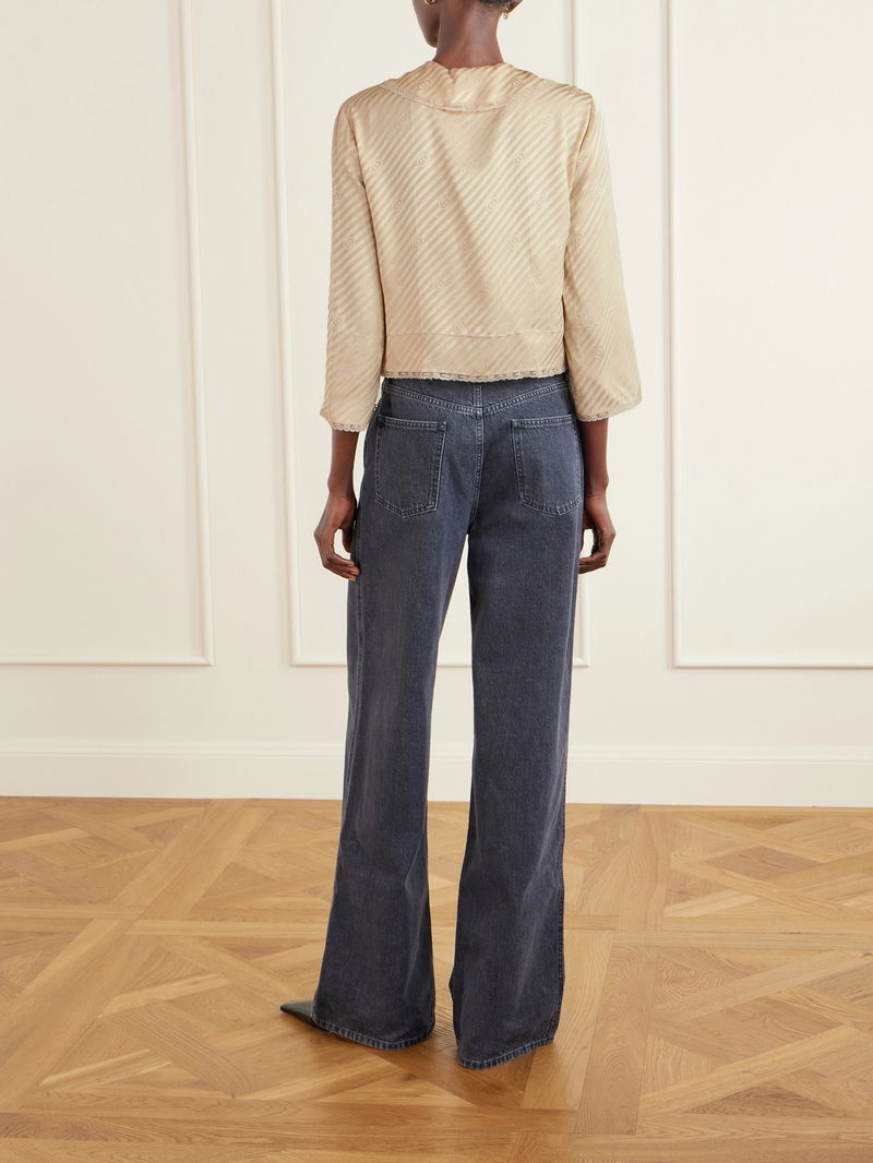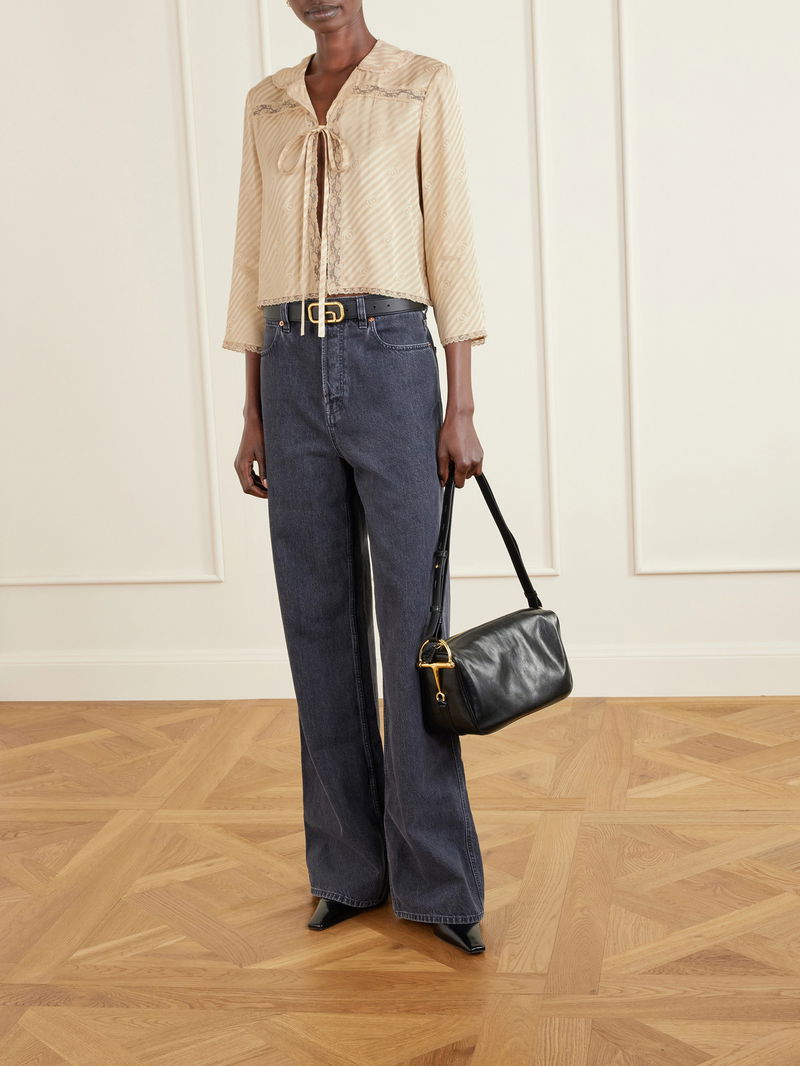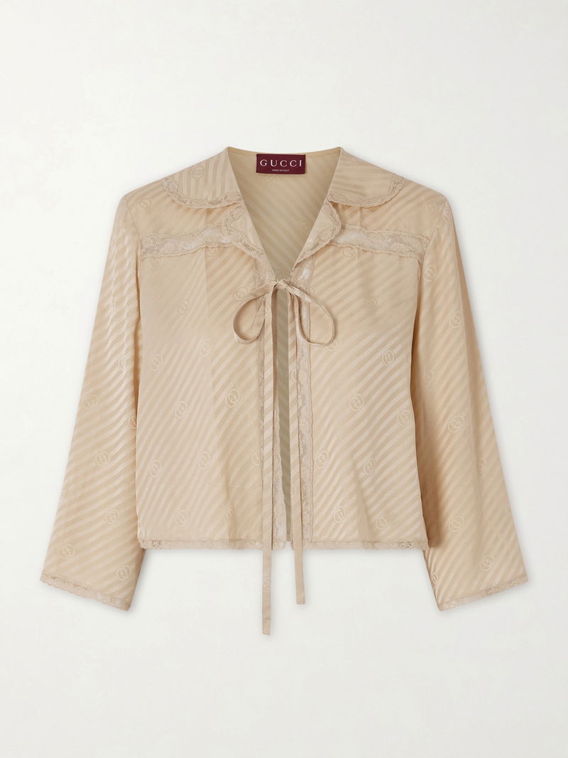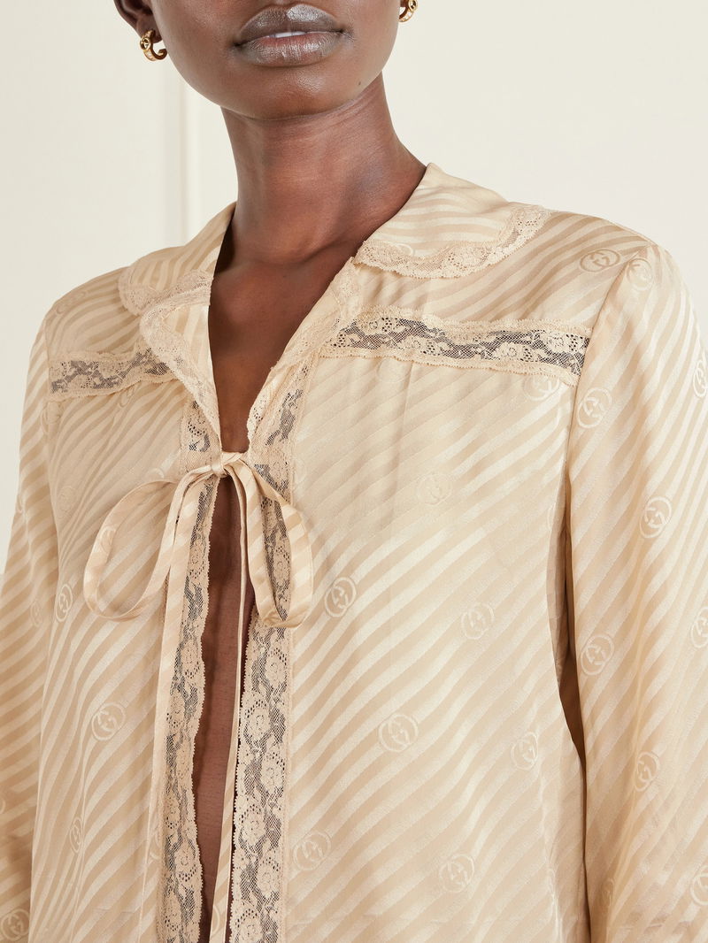 Gucci's pajama-style blouse has a beautiful vintage quality. It's been tailored in Italy from silk-jacquard patterned with the iconic GG monogram and tonal stripes. An open collar, self-tie bow and delicate Leavers lace trim complete the elegant design.