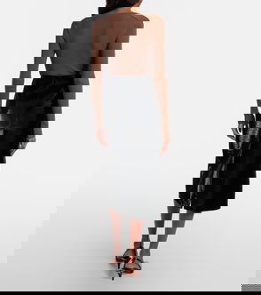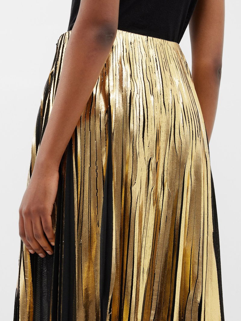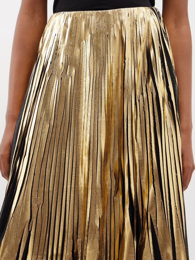 Made in Italy, Gucci's gold lamé midi skirt sits high on the waist and falls into pressed liquid-like pleats interspersed with black tulle panels.