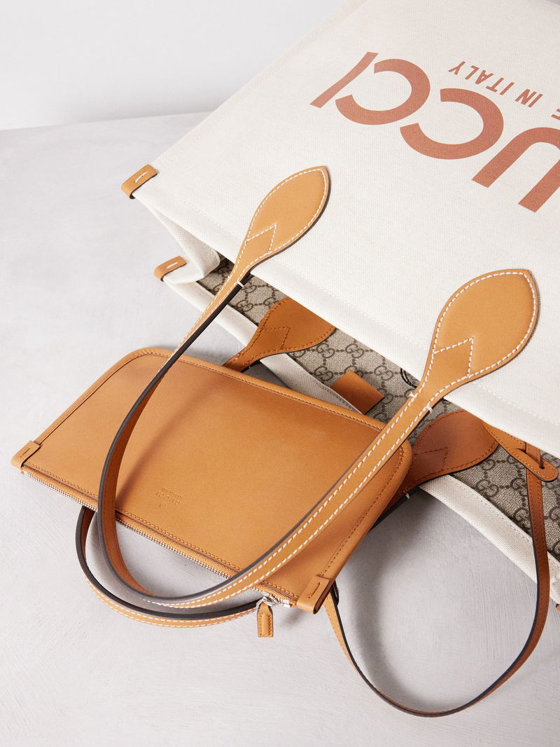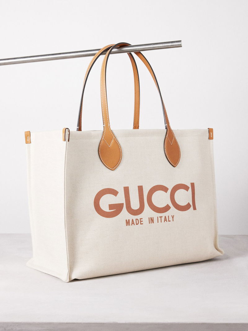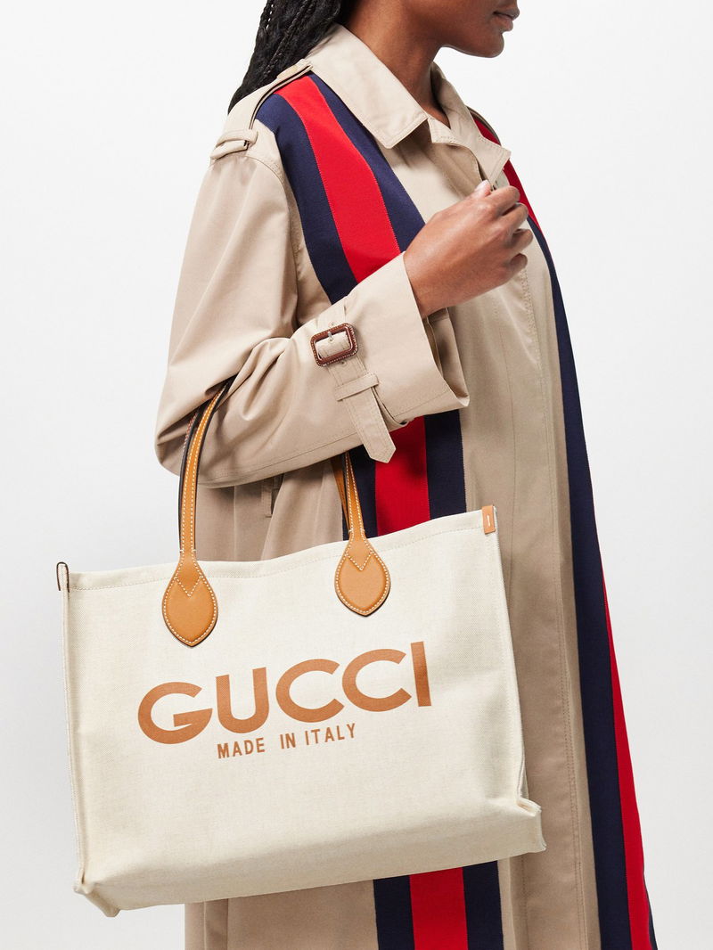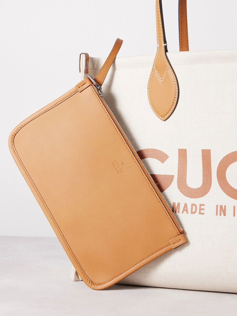 Gucci's cream canvas tote bag is emblazoned with a 'made in Italy' logo print and comes with a zipped leather pouch for safely storing valuables.