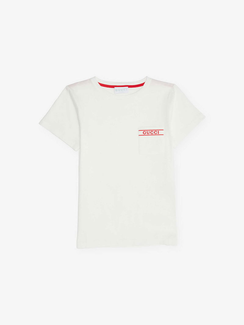 Gucci cotton t-shirt. Crewneck, short sleeves, one patch pocket at front, logo print at pocket, straight hem.