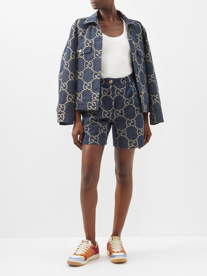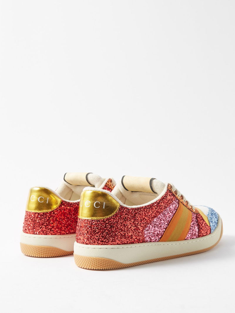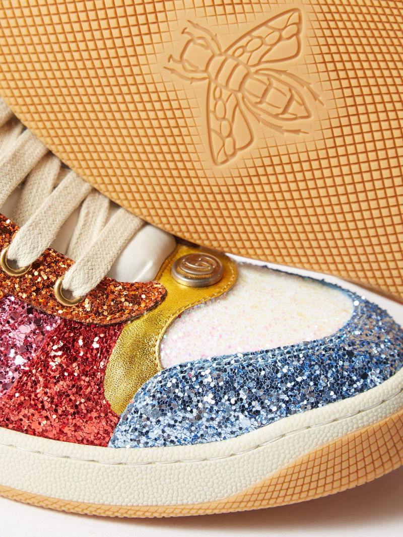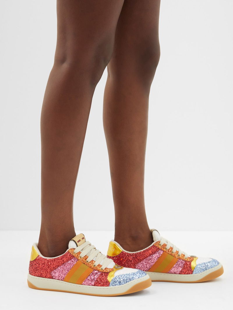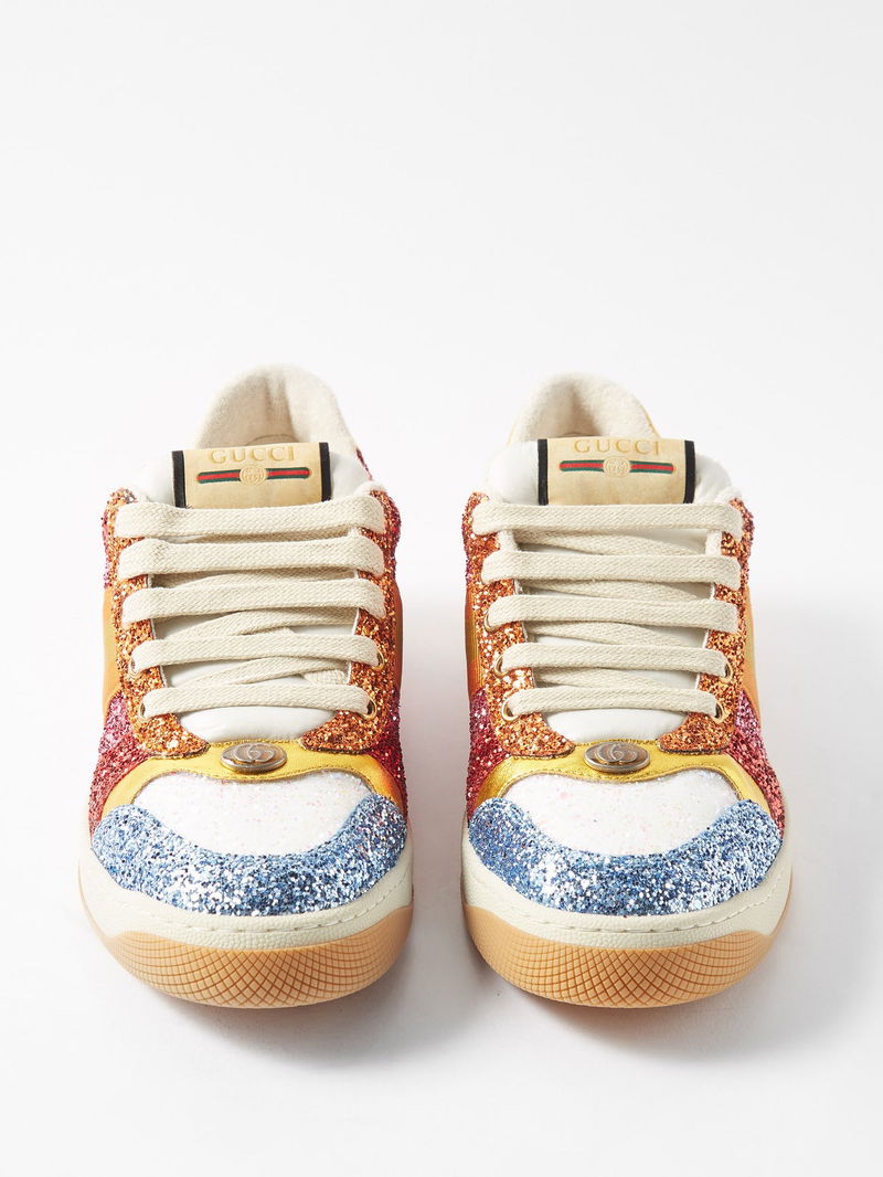 Gucci’s multicoloured Lovelight Screener trainers are made from canvas covered with sparkling glitter with tongue and heel logos for a glamorous riff on the sporty style.
