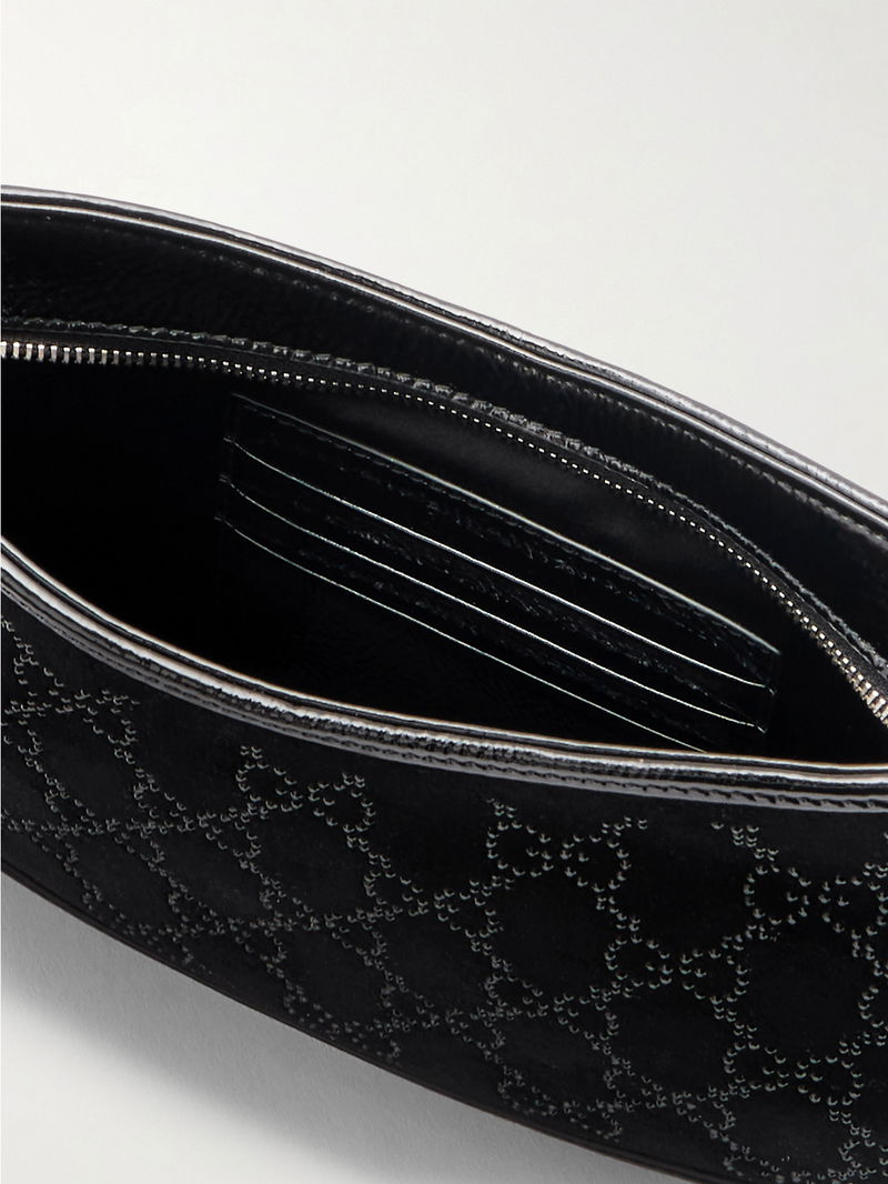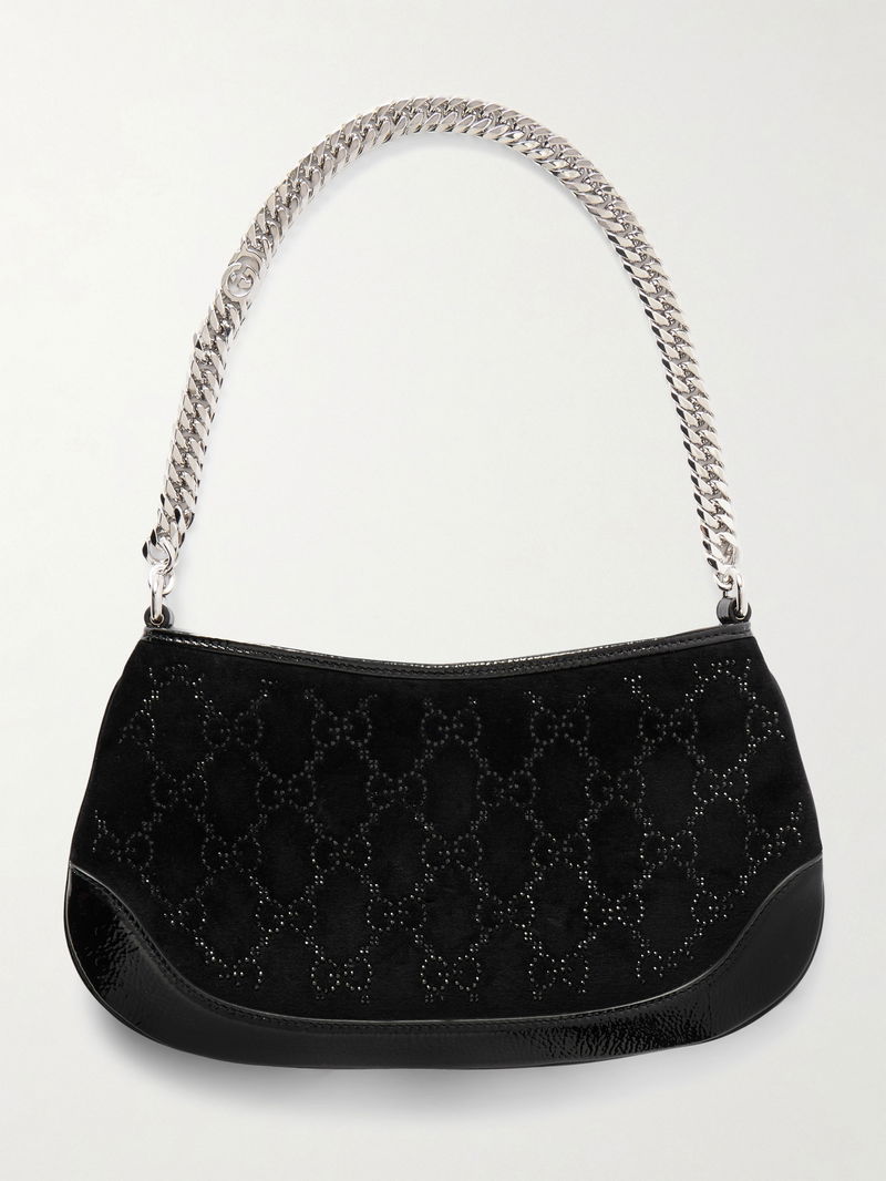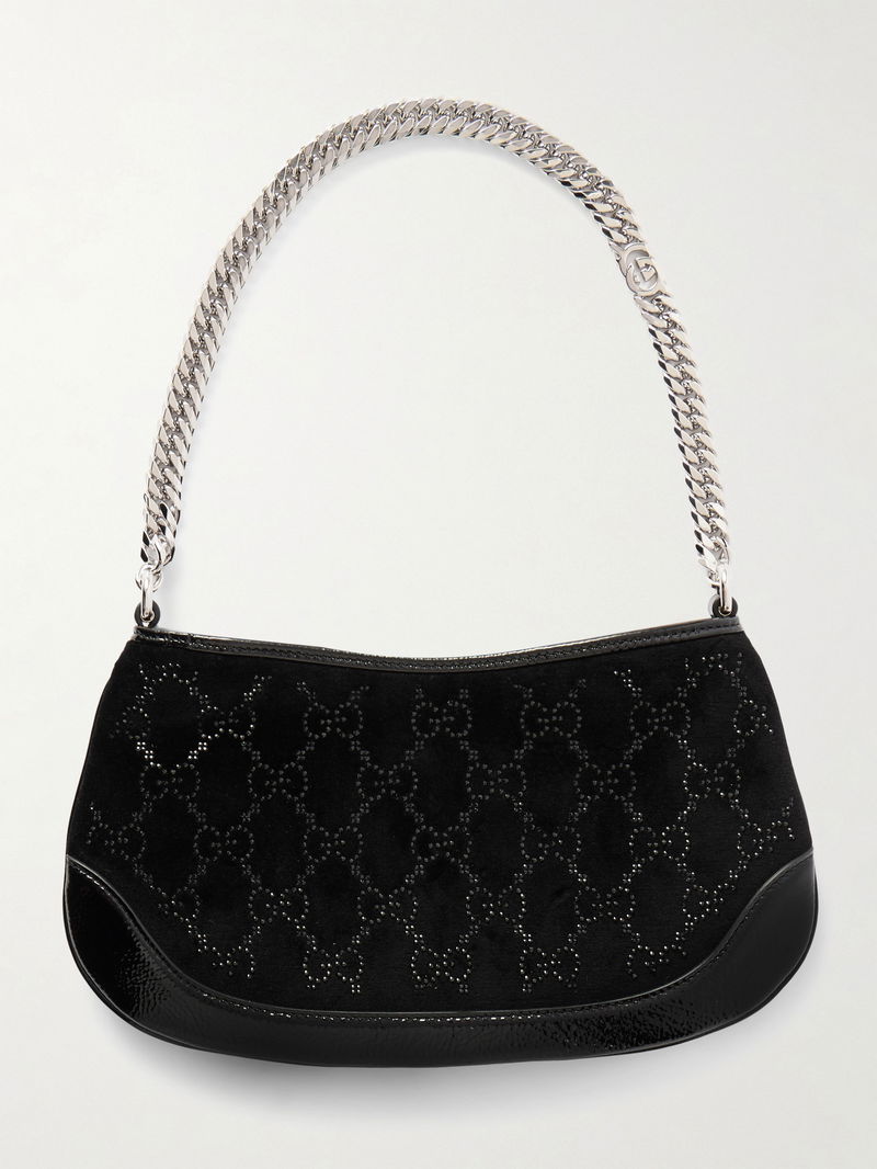 Patent Leather-trimmed Crystal-embellished Velvet Shoulder Bag