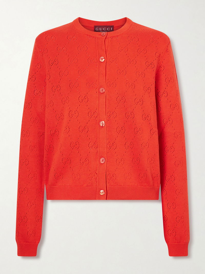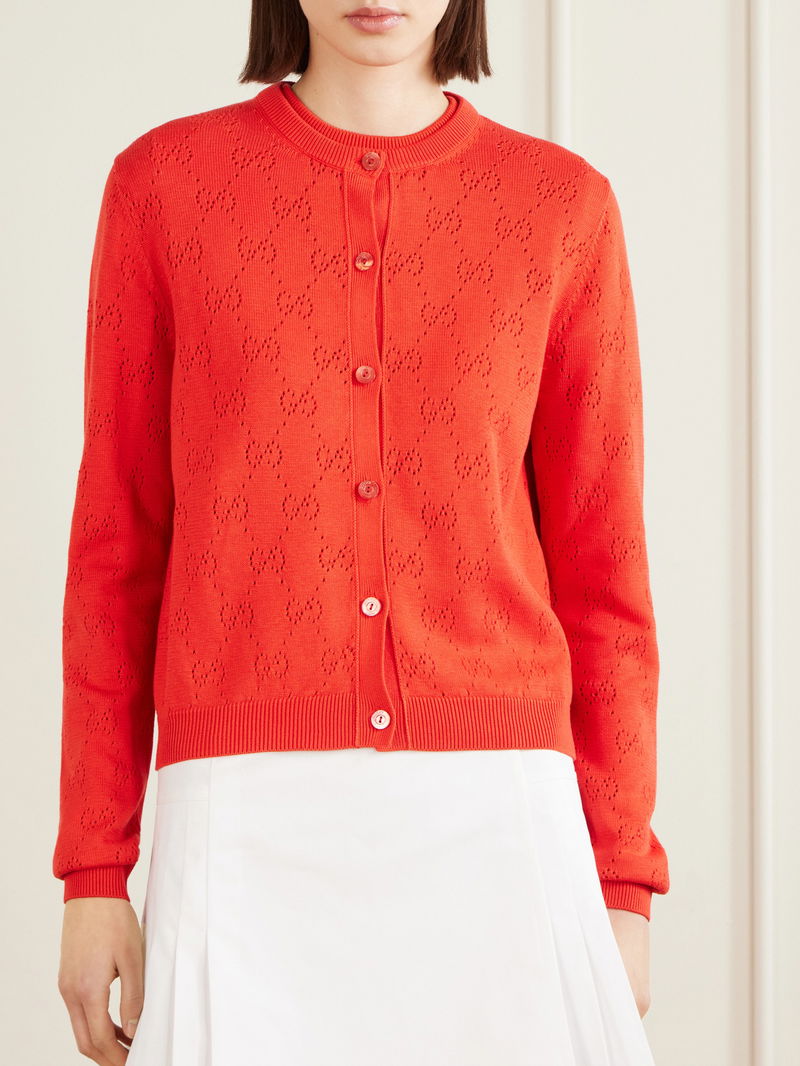 For the Cruise ’26 collection, Gucci reimagines its heritage codes in new textures and shades. Knitted from silk-blend with a generous helping of cotton, this chic cardigan is pierced all over with the iconic 'GG' monogram motif. Wear it buttoned up with tailored pants or layered over a simple tank.