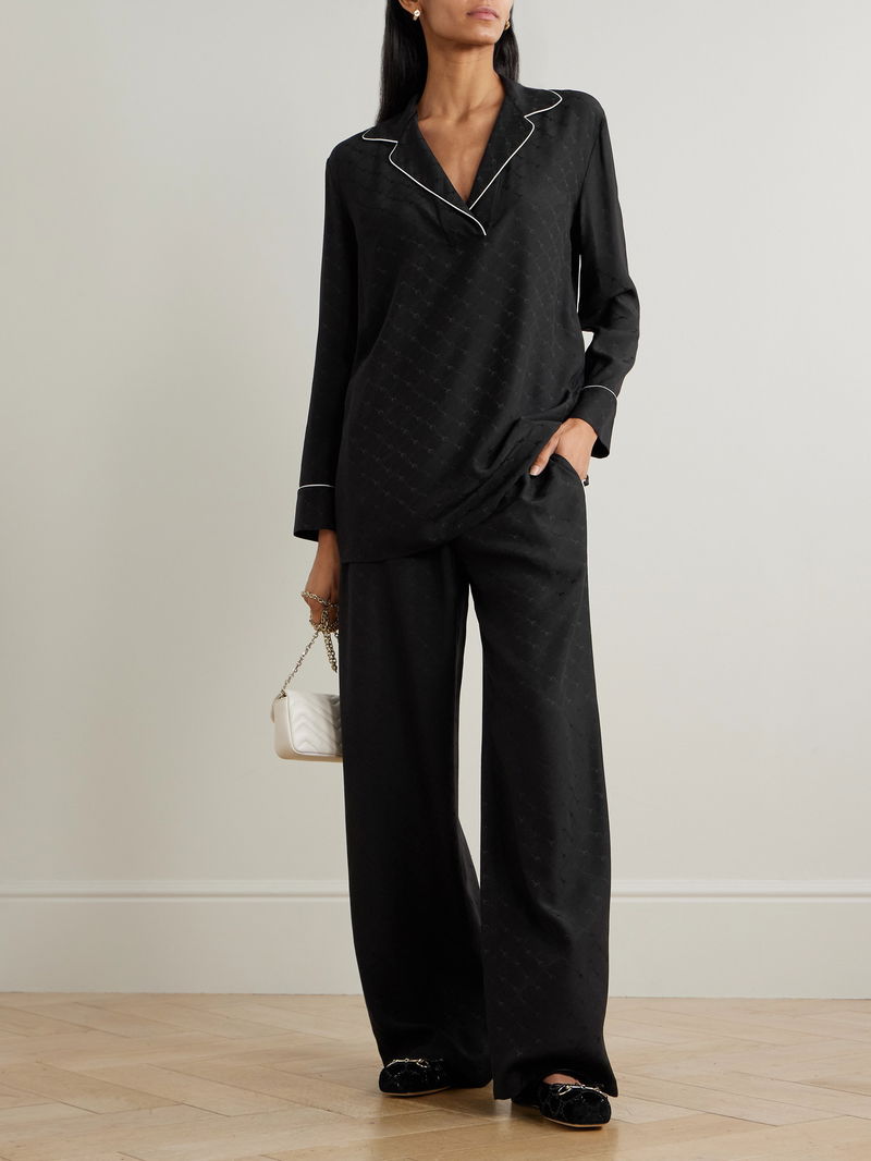The satin piping on Gucci's pants gives them an athleisure feel. They've been tailored in Italy from smooth silk-jacquard and have a lattice-like horsebit pattern for a nod to the brand's equestrian heritage.