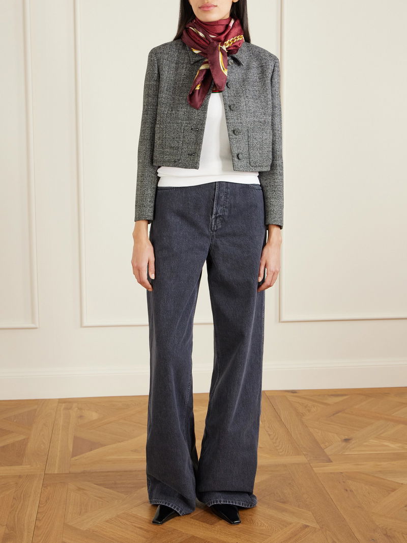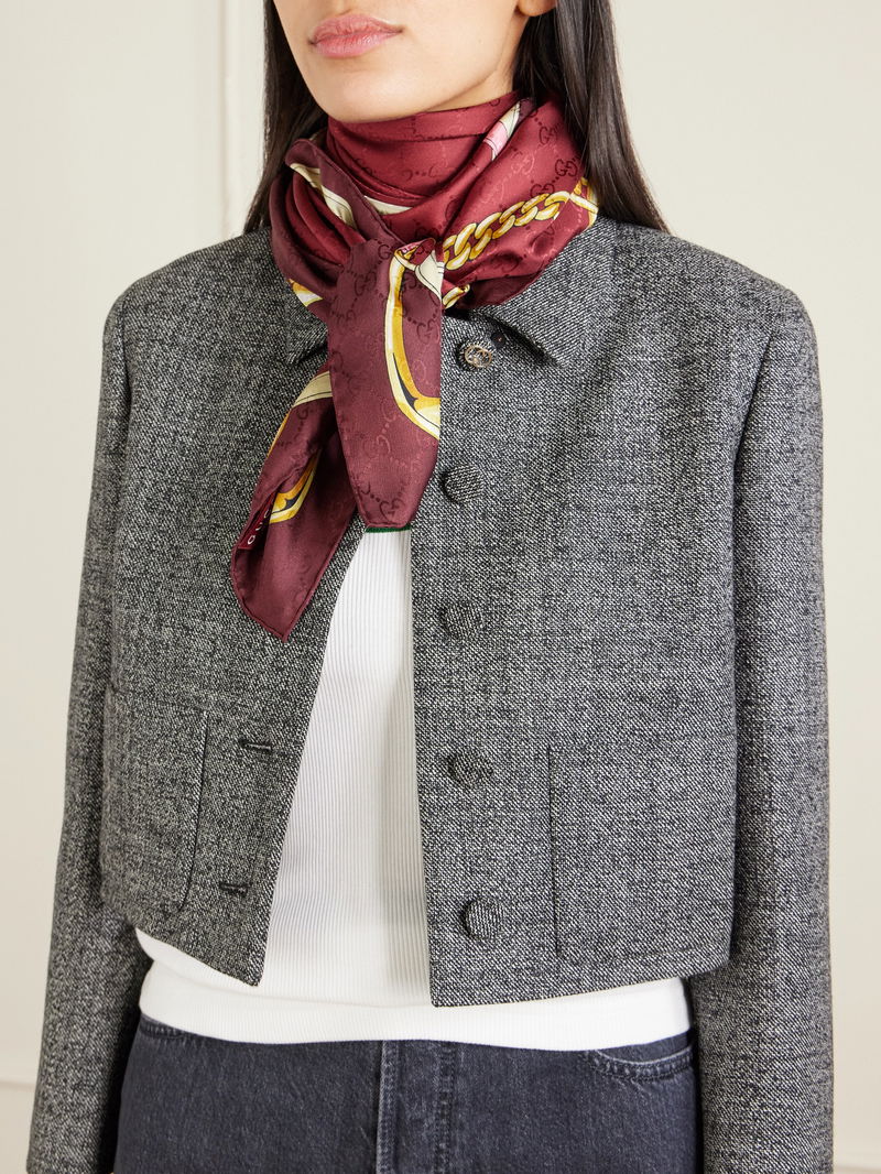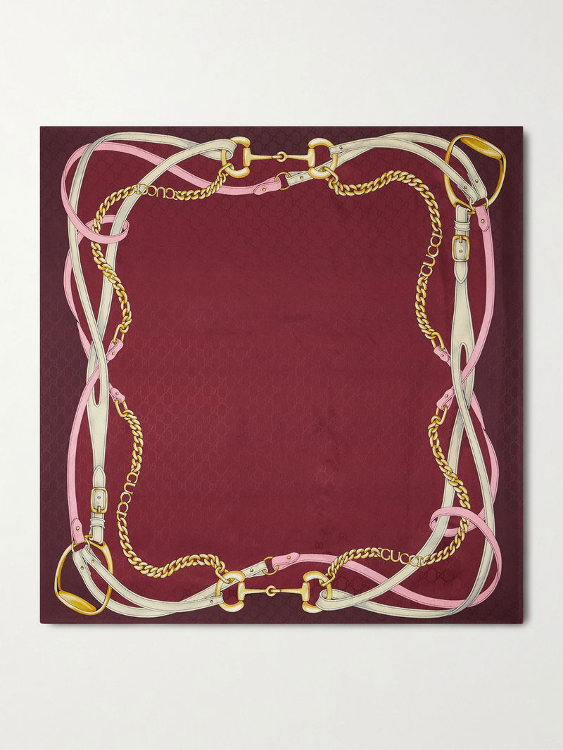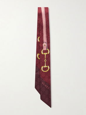 Gucci's scarf encompasses all the hallmarks of the house, including the horsebit chain and logo print. It has been made in Italy from soft silk-twill and jacquard-woven with a subtle monogrammed backdrop. It'll lend a vintage feel to your favorite outfits.