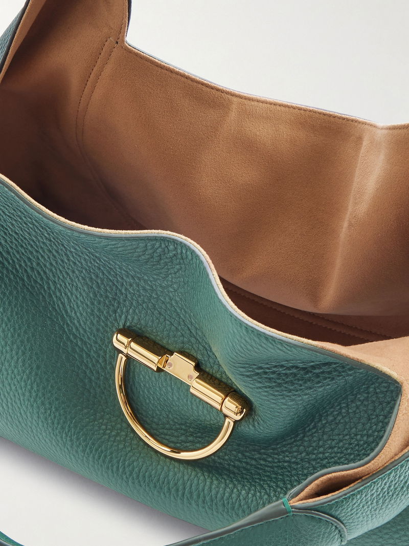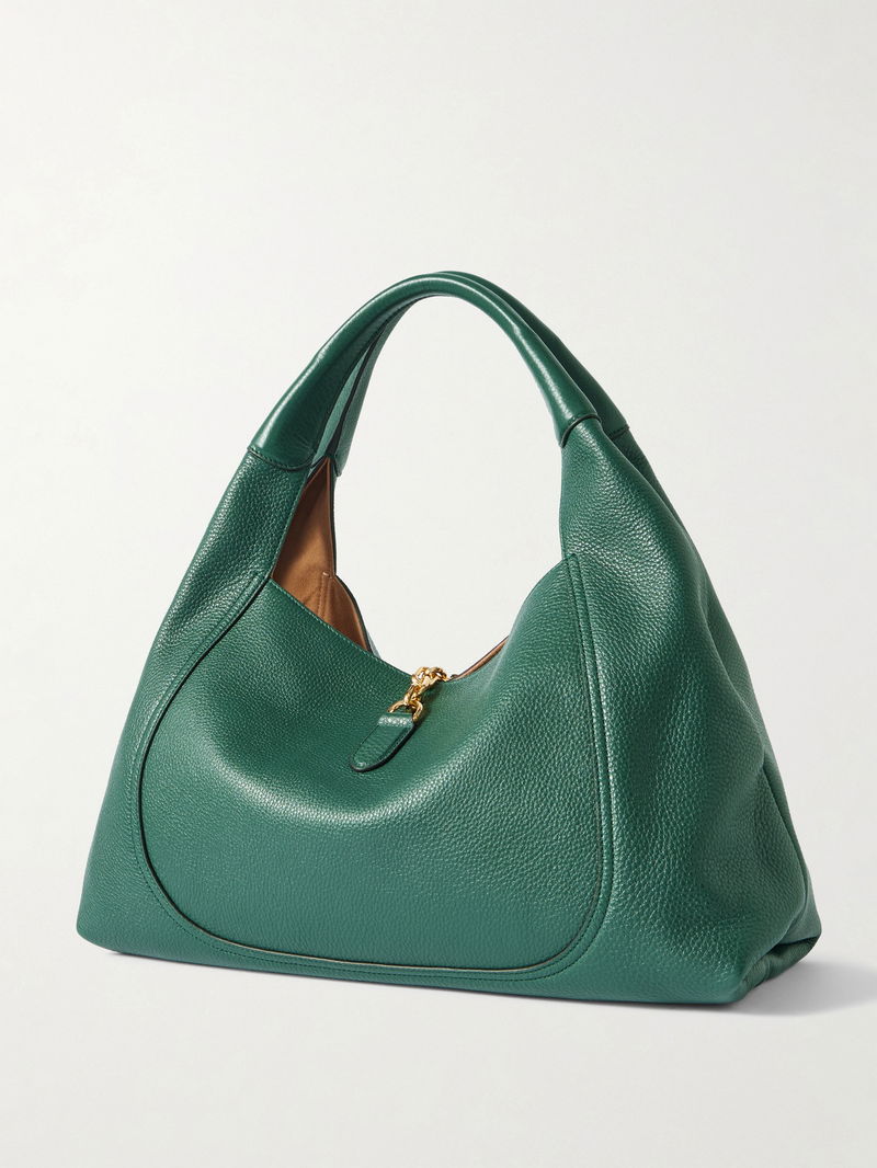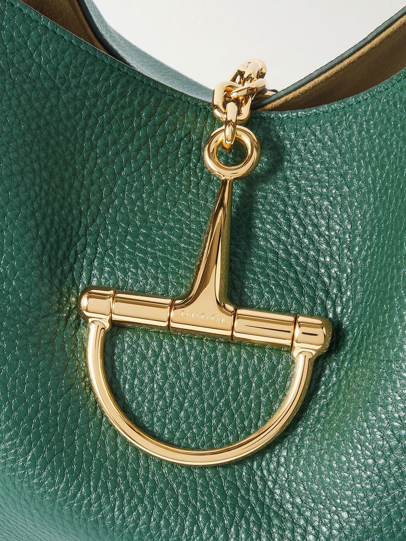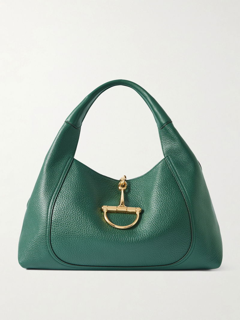 Gucci's tote features a half, magnified version of the label's signature horsebit plaque, which also serves as the fastening. Made from textured-leather, it has a slouchy shape that'll fit comfortably under your arm. There is more than enough space for your wallet, phone, keys and a small compact.