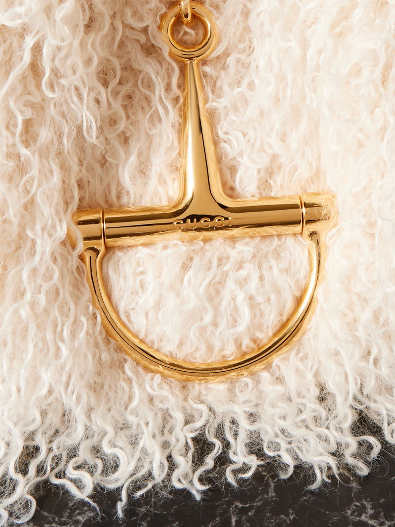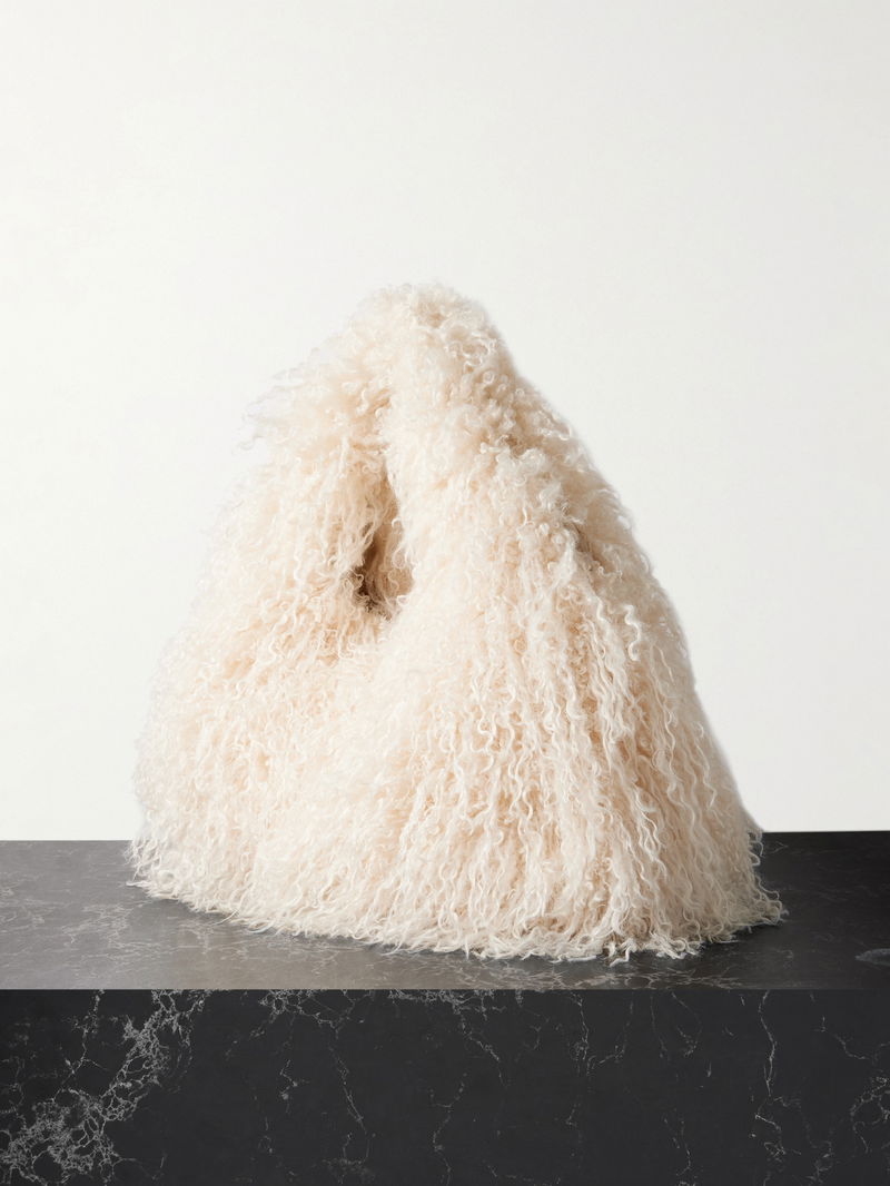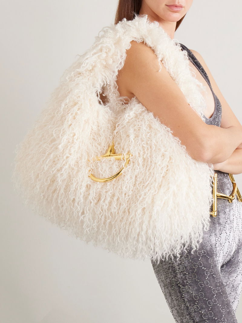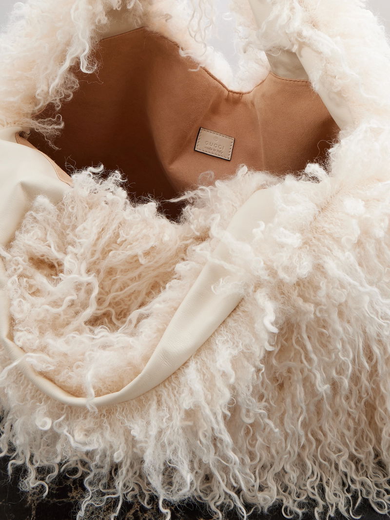 Gucci's tote features a half, magnified version of the label's signature horsebit plaque that also serves as the fastening. It's made from fluffy shearling and has a slouchy shape that'll fit comfortably under your arm. It's lined in smooth suede and has more than enough space for a continental wallet, phone, keys and small compact.