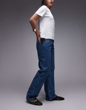 Regular fit, mid-rise, straight leg, structured waistband with belt loops, five pockets, brand patch at back, mid-wash, branded hardware