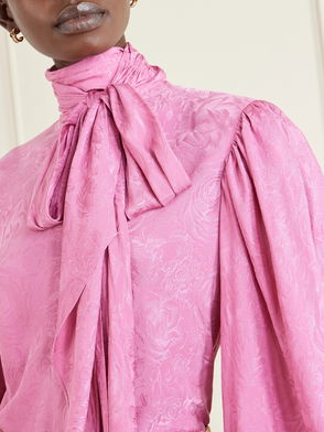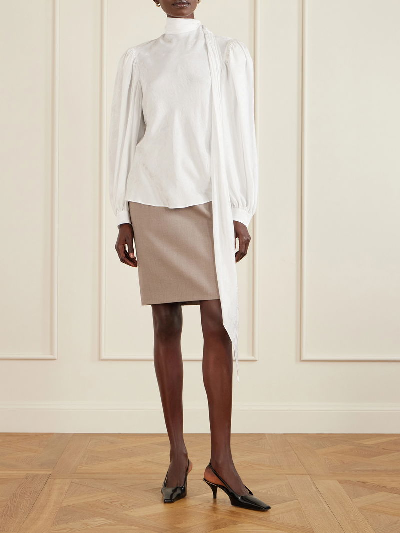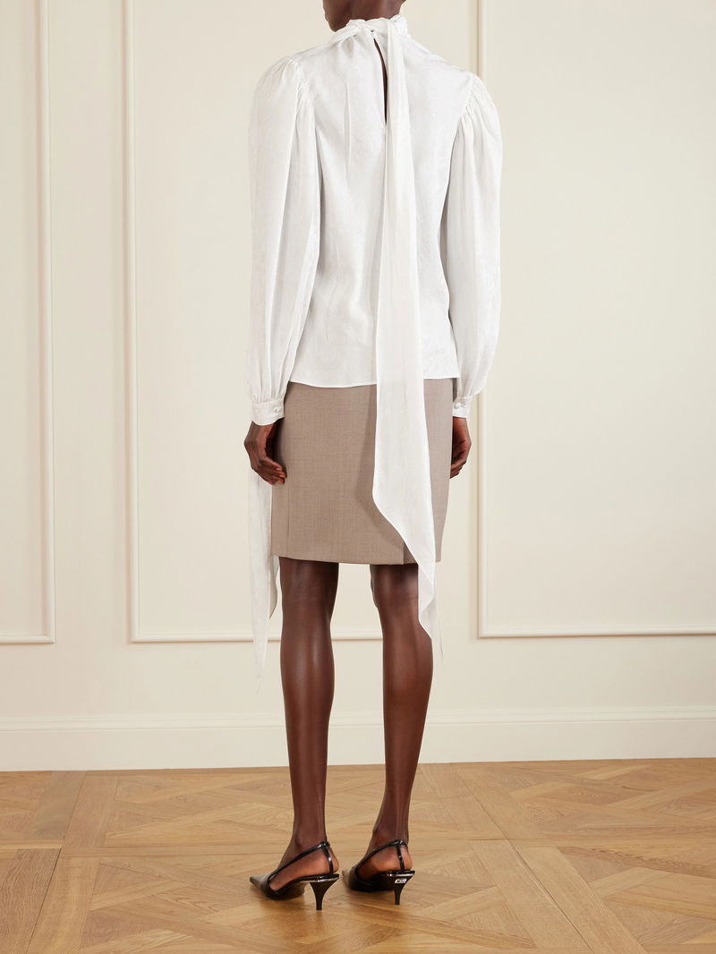 Gucci's blouse will effortlessly slot into your wardrobe, whether for work or the weekend. It's been cut in Italy from soft satin-crepe and is subtly patterned with jacquard florals. A long, sweeping necktie complements the voluminous sleeves.