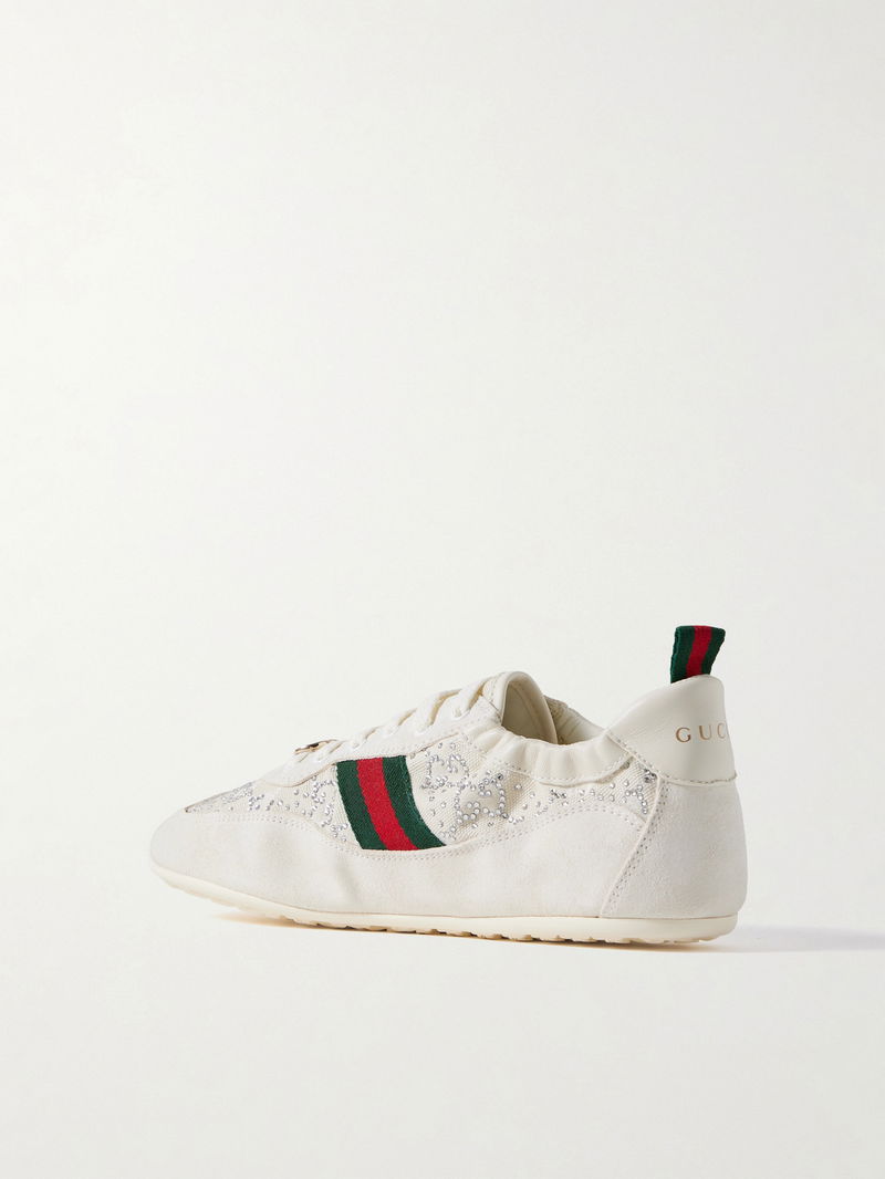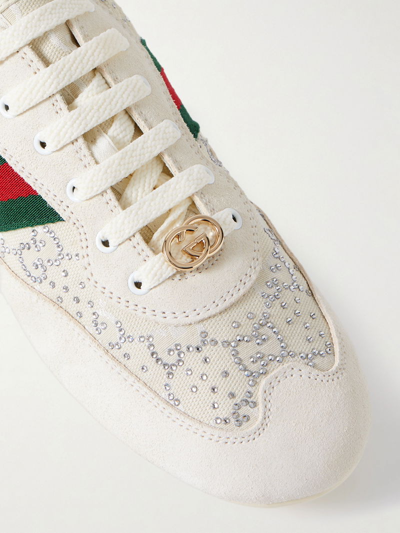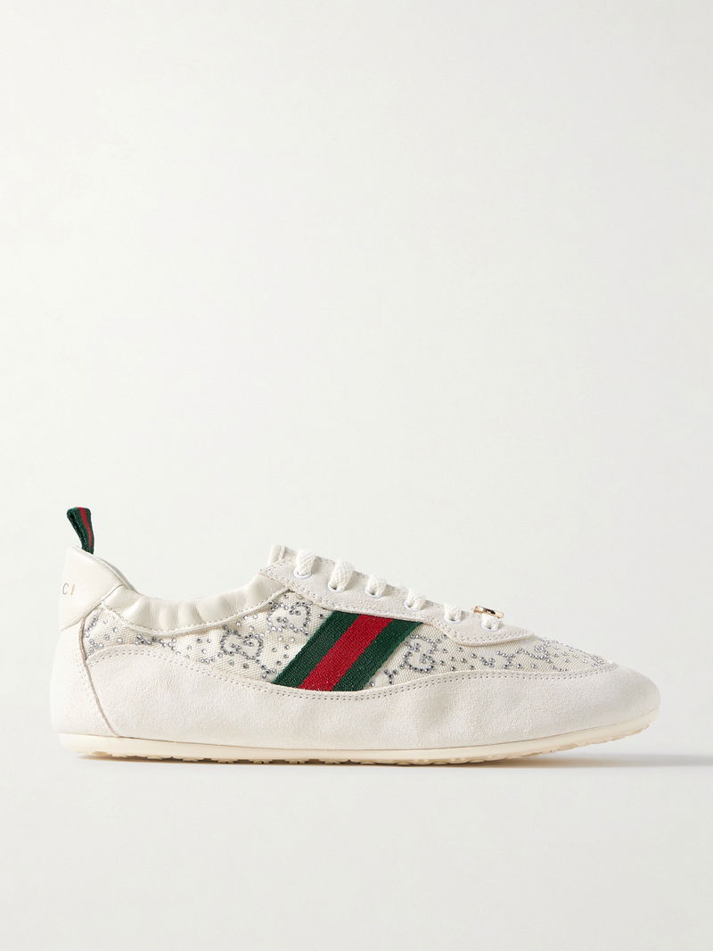 Webbing And Leather-trimmed Embellished Mesh And Suede Sneakers