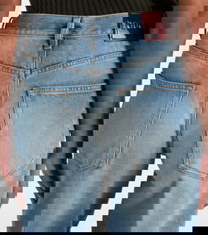 Relaxed fit, mid-rise, wide leg, structured waistband with belt loops, five pockets, brand patch at back, mid-wash, contrast stitching, branded hardware