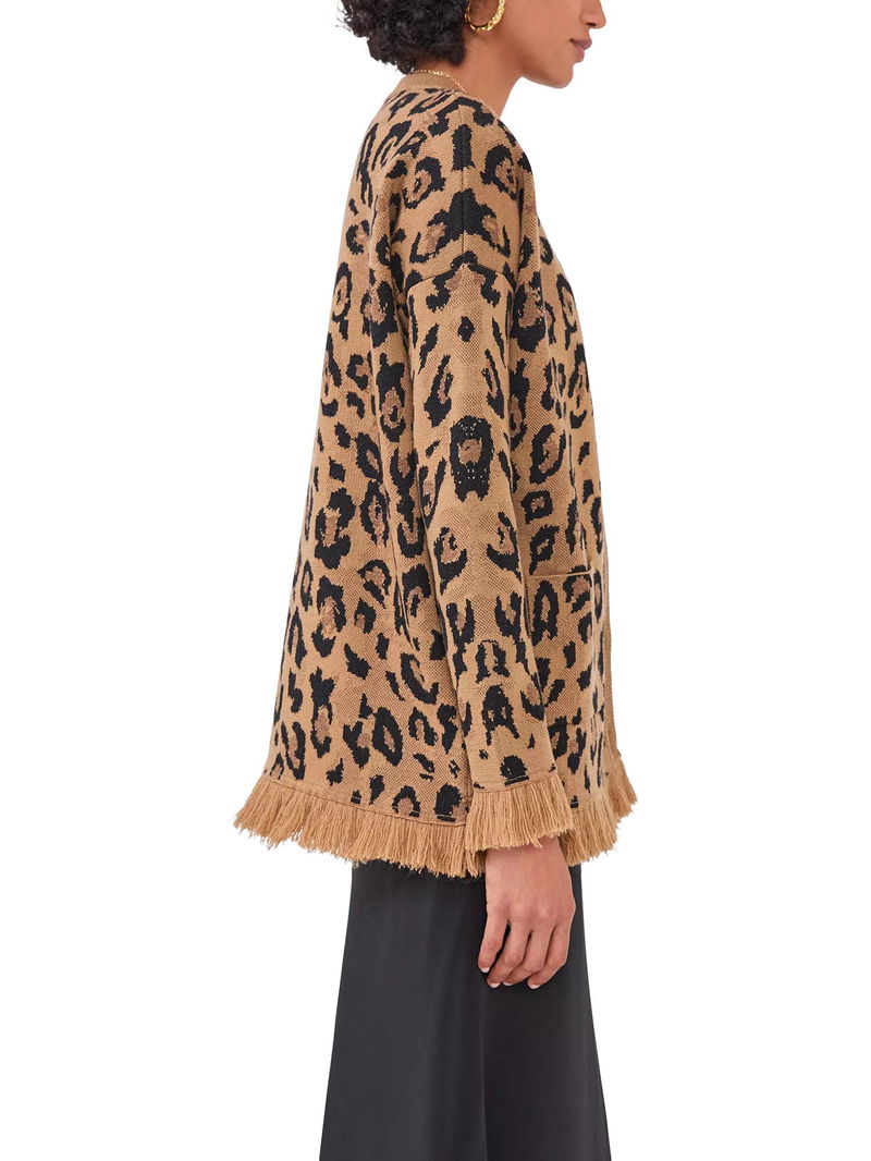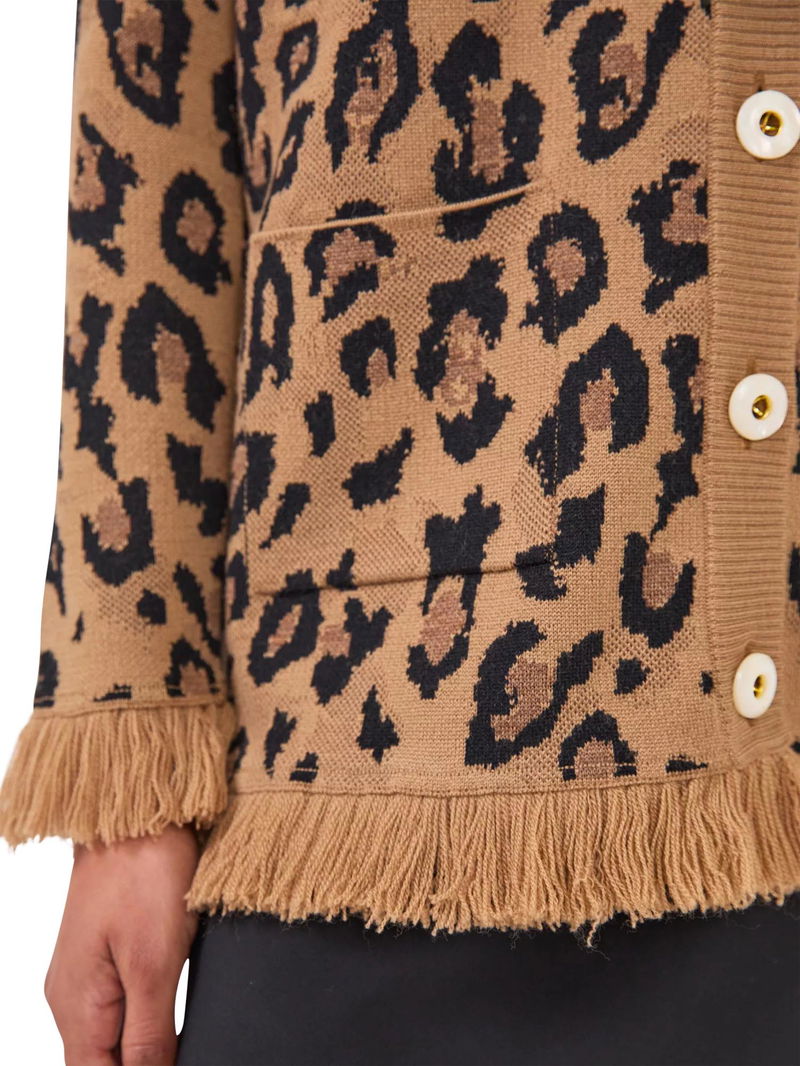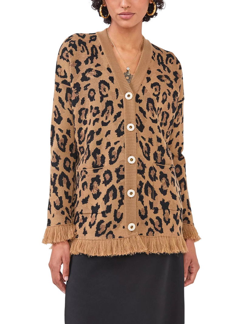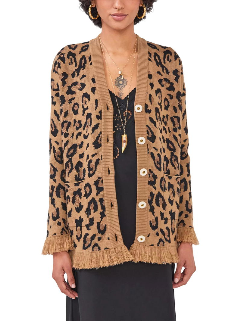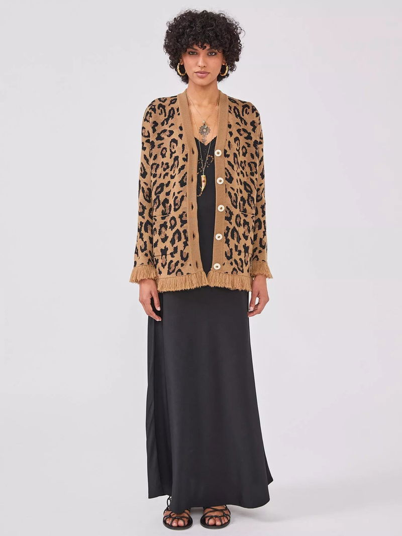 Putting a fresh spin on animal print, this cardigan by Hayley Menzies is made from a wool-rich fabric and is adorned with leopard spots throughout.