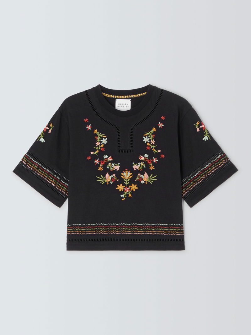 Take "just a t-shirt and jeans" to the next level. Crafted from 100% cotton, a casual t-shirt shape becomes something extraordinary in our hands with a boxy cropped shape, wide sleeves and the most beautiful wild flowers which have been machine embroidered by artisans in India. Add ladder lace inserts for a bohemian finish that will fit as seamlessly into a laid back holiday wardrobe with shorts as it will a chic social event with a silk skirt.