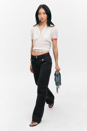 Bootcut pants, Twill, Stitched front creases, Cropped, Two side slant pockets, Two back welt pockets, High-rise cut, Concealed hook, button and zip fastening at front, Mid-weight, stretchy fabric.