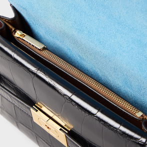 Happy Tweency features the iconic wink twist lock and signature trapunto flap edge detail. With an adjustable leather threaded chain strap that can be worn on the shoulder or cross body. Lined in Italian calf suede with an internal slide pocket.
