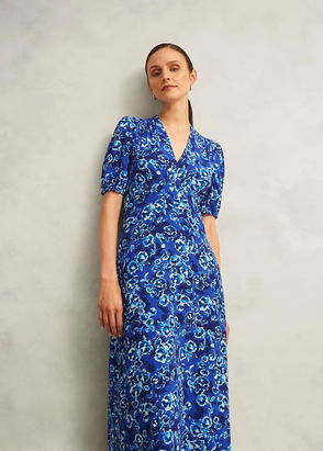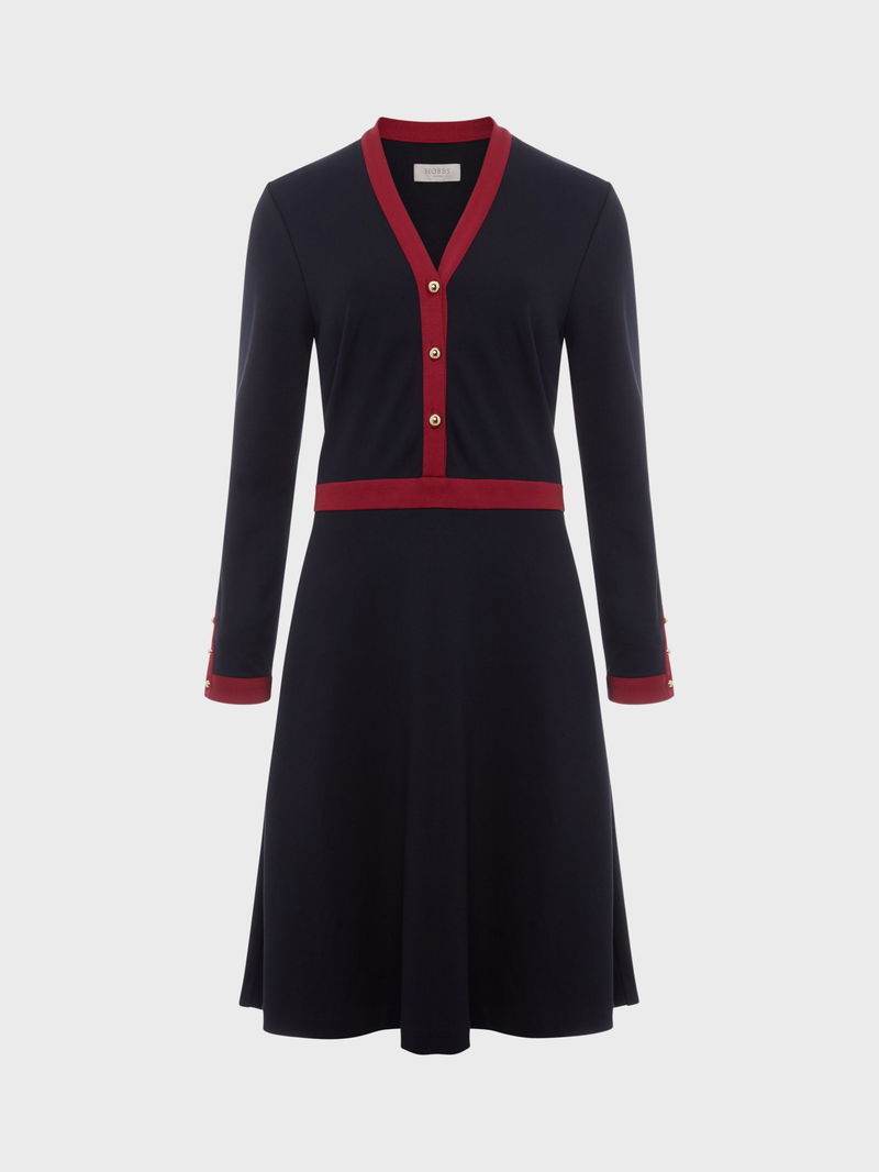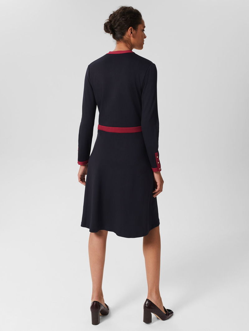 In a flattering fit-and-flare silhouette, this knee-length dress by Hobbs complements bold accessories with its plain canvas. Framed with a contrast trimmed v-neckline and long sleeves, this piece will ensure you're the centre of attention in the work place.