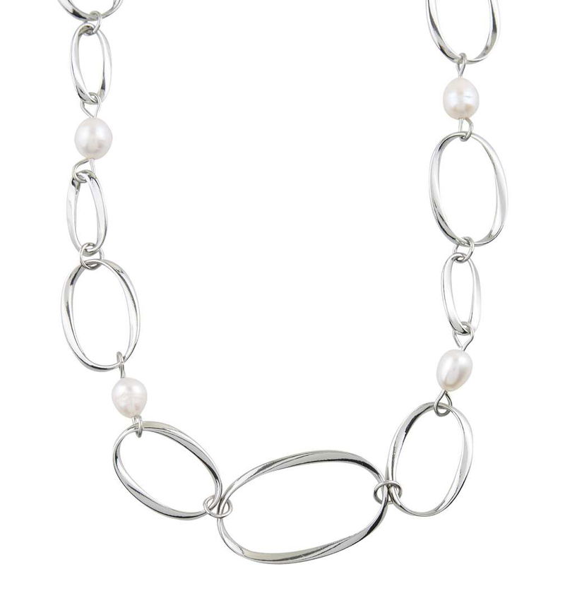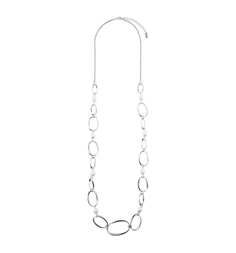 The Anna long necklace is perfect for adding a striking accent to everything from LBDs to casual outfits. Fastening with an adjustable silver chain, it's strung with an assortment of graduated beaten-silvertone links and pearls.