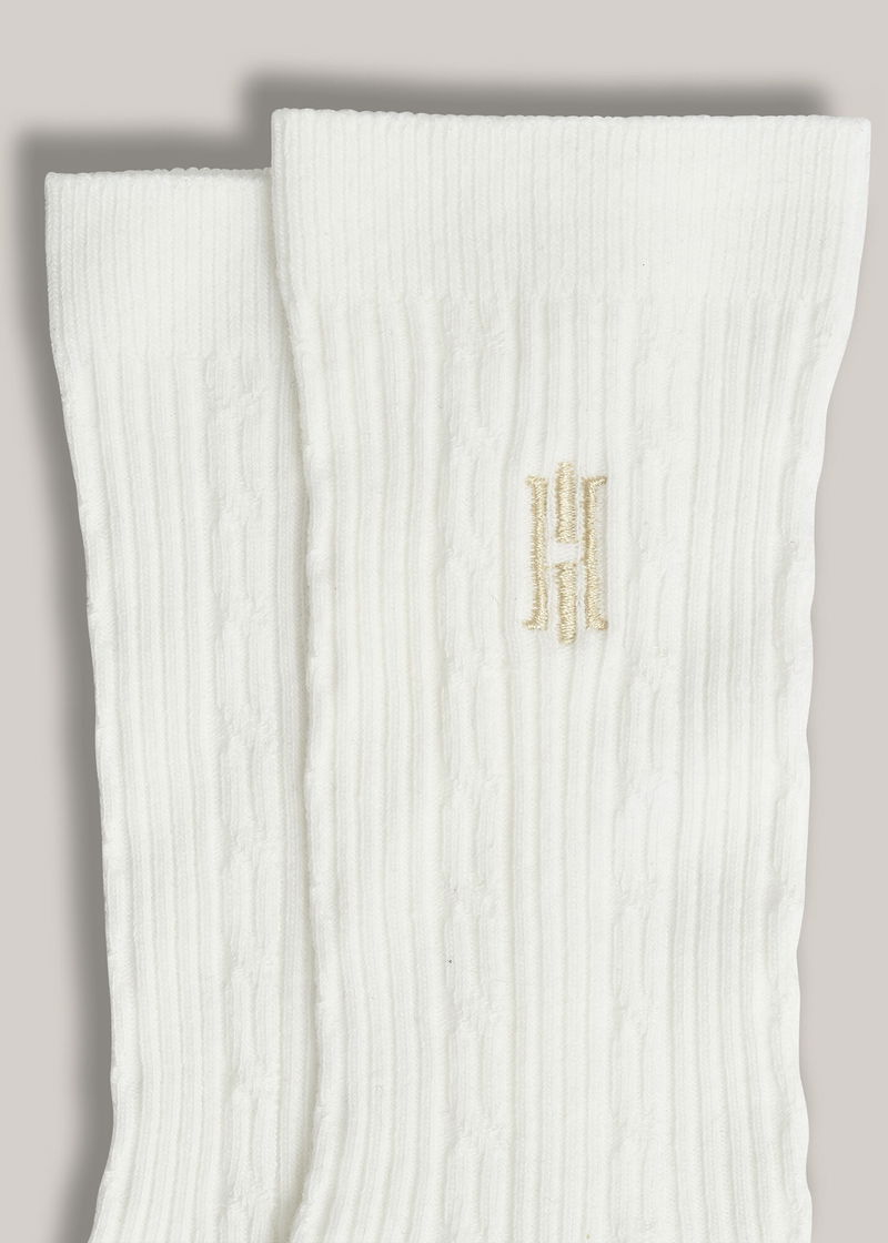 Little luxuries: Embroidered with tonal, H-mark stitching, these cable knit socks are the perfect, cosy, finishing touch.
