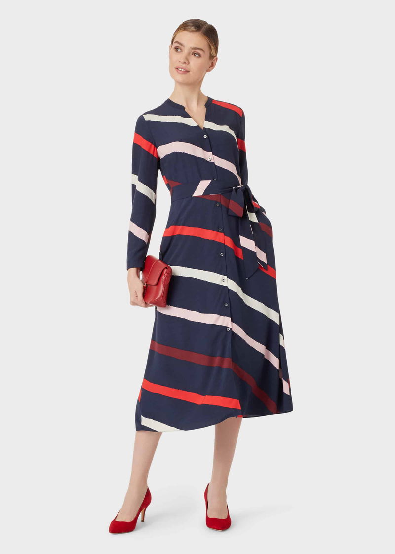 Instant impact. In a striking stripe print, the Ginnie shirt dress is cut to a flattering fit and flare silhouette that falls to an on-trend midi length. A self-tie belt nips you in at the waist. Style with trainers at the weekend and courts for work. Lined. Also available in petite