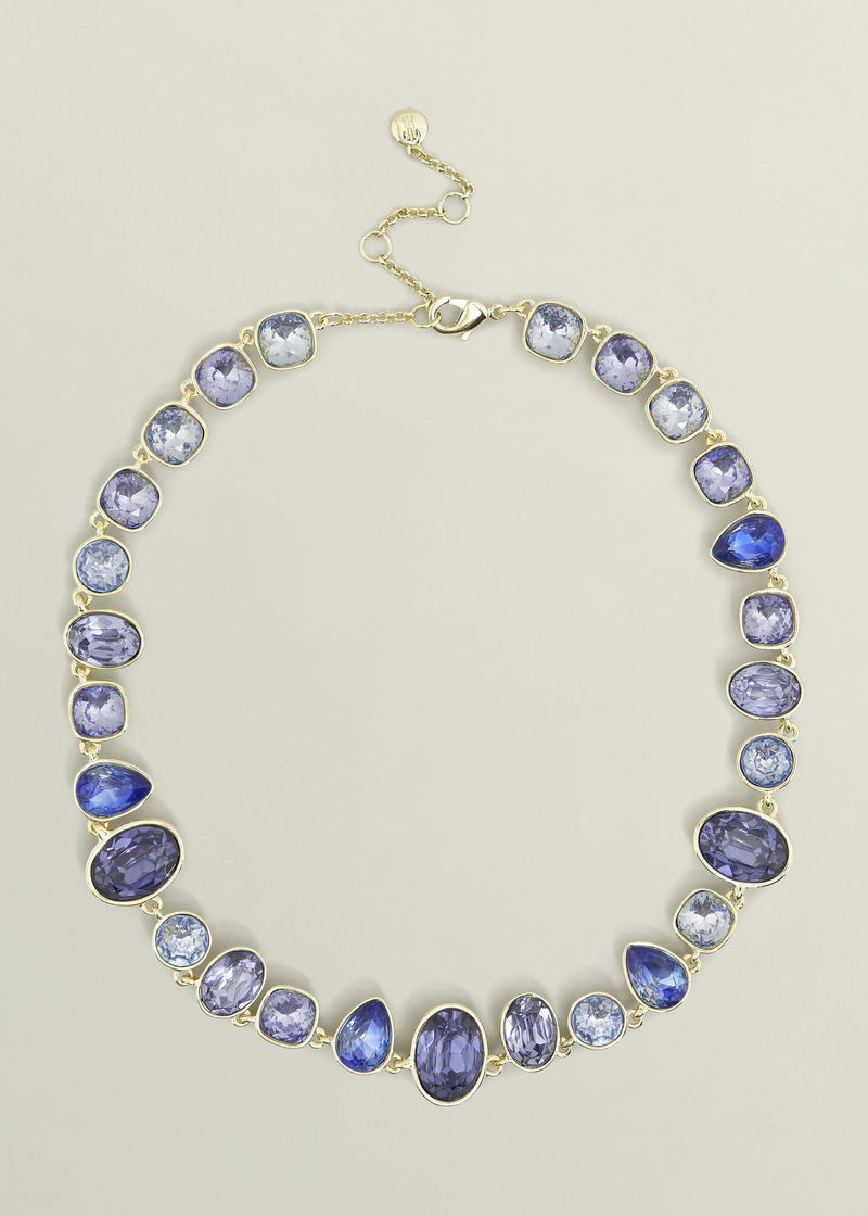 Oceanic opulence adorns the Indira necklace through elegant glass-cut gems and gold-tone metal.