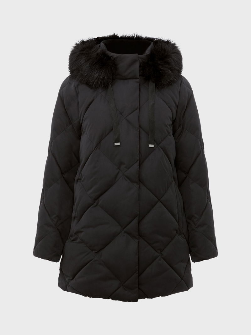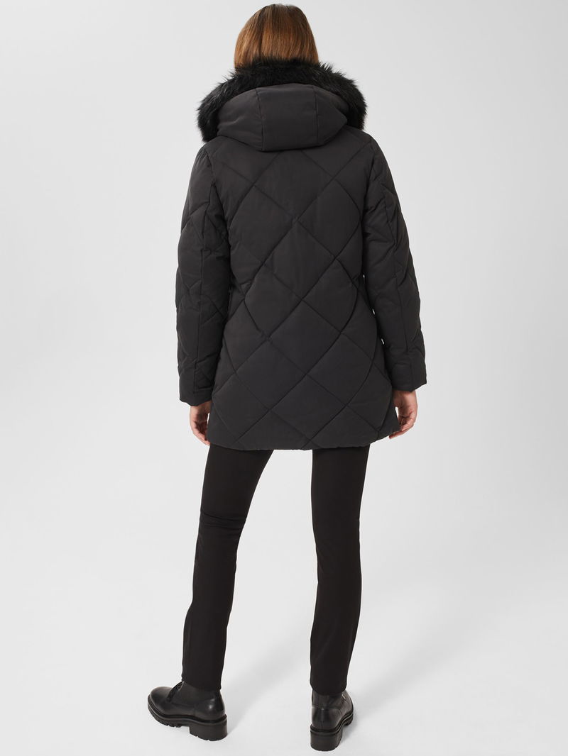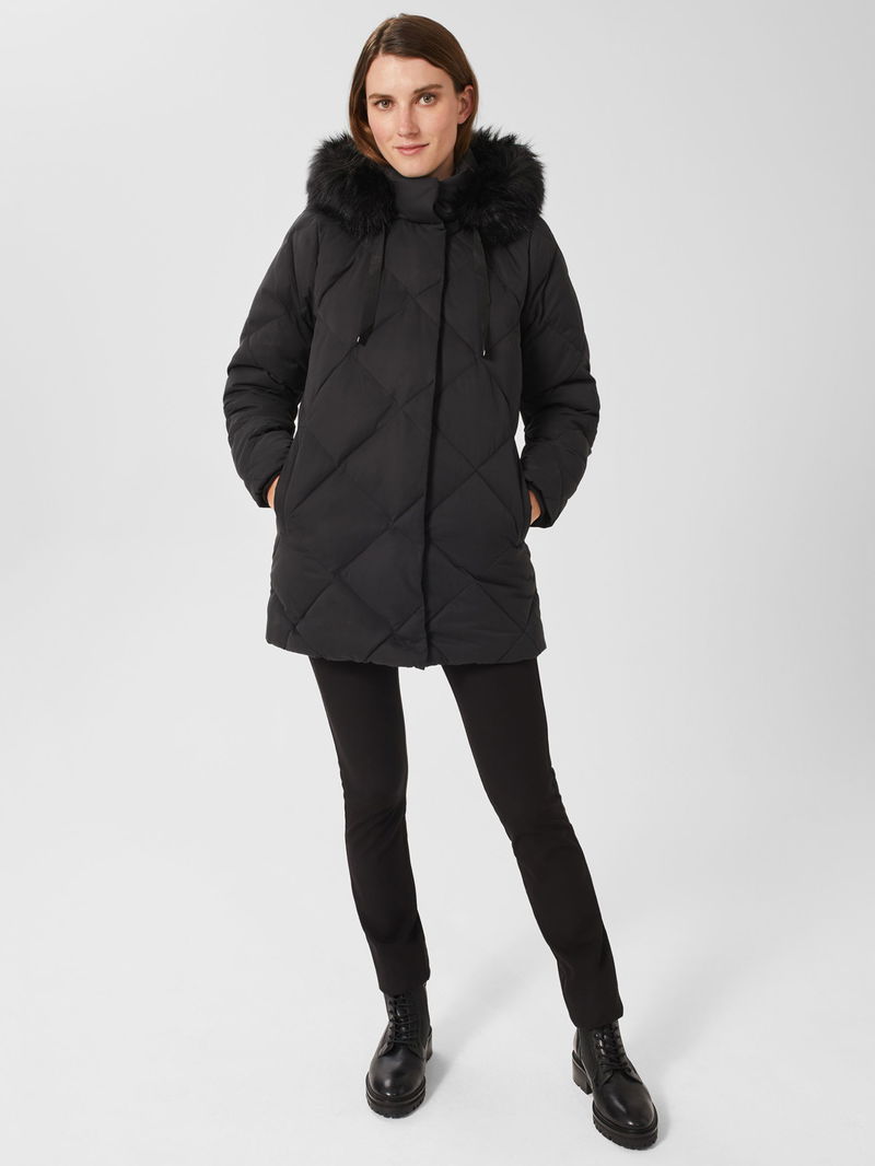 Packed full for a cosy piece, this quilted coat by Hobbs elongates your profile with its longline cut. Hooded with a faux fur trim for when the heavens open, it is fashioned from long-lasting fabric that will see away the cold.