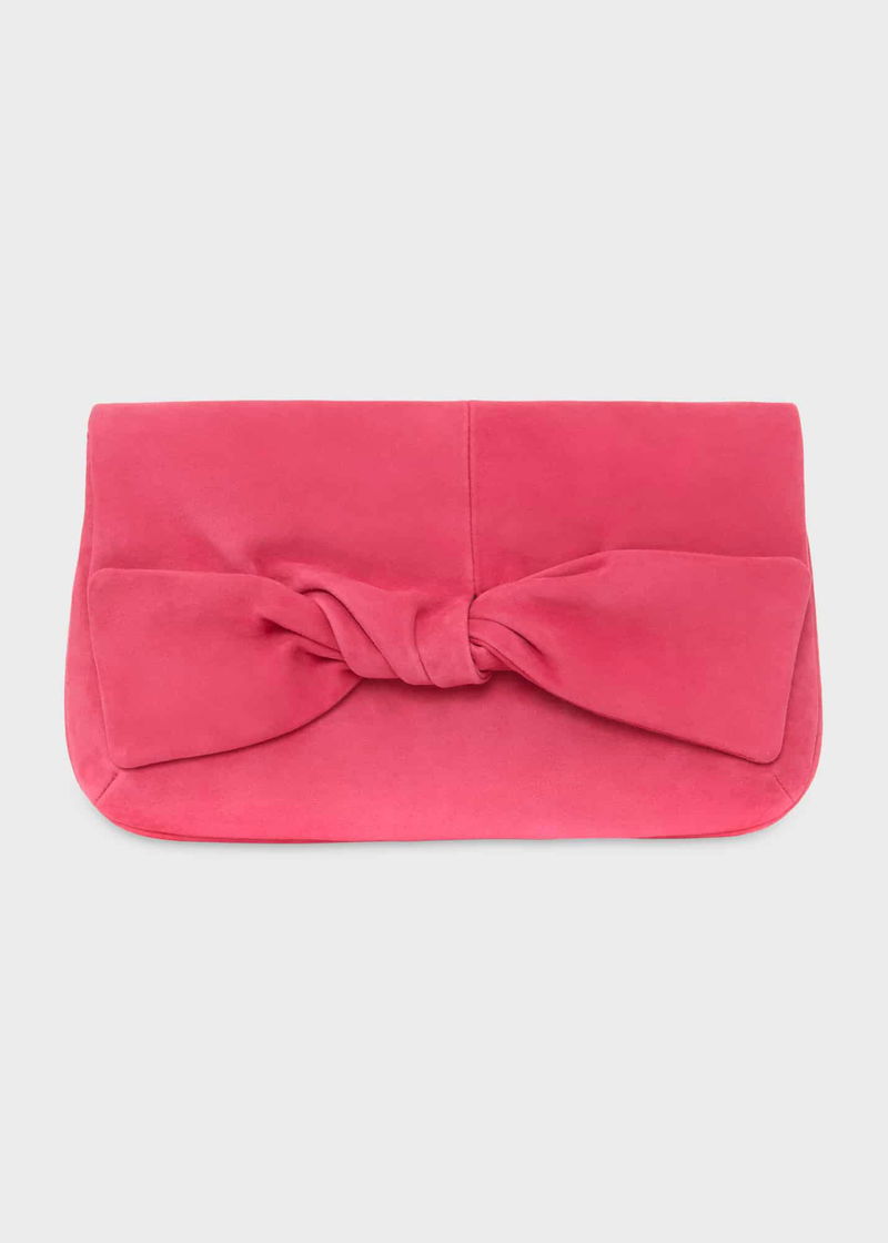 The perfect plus one. Made from a pink suede fabric, the Milly bow clutch will add a feminine touch to your event outfits.