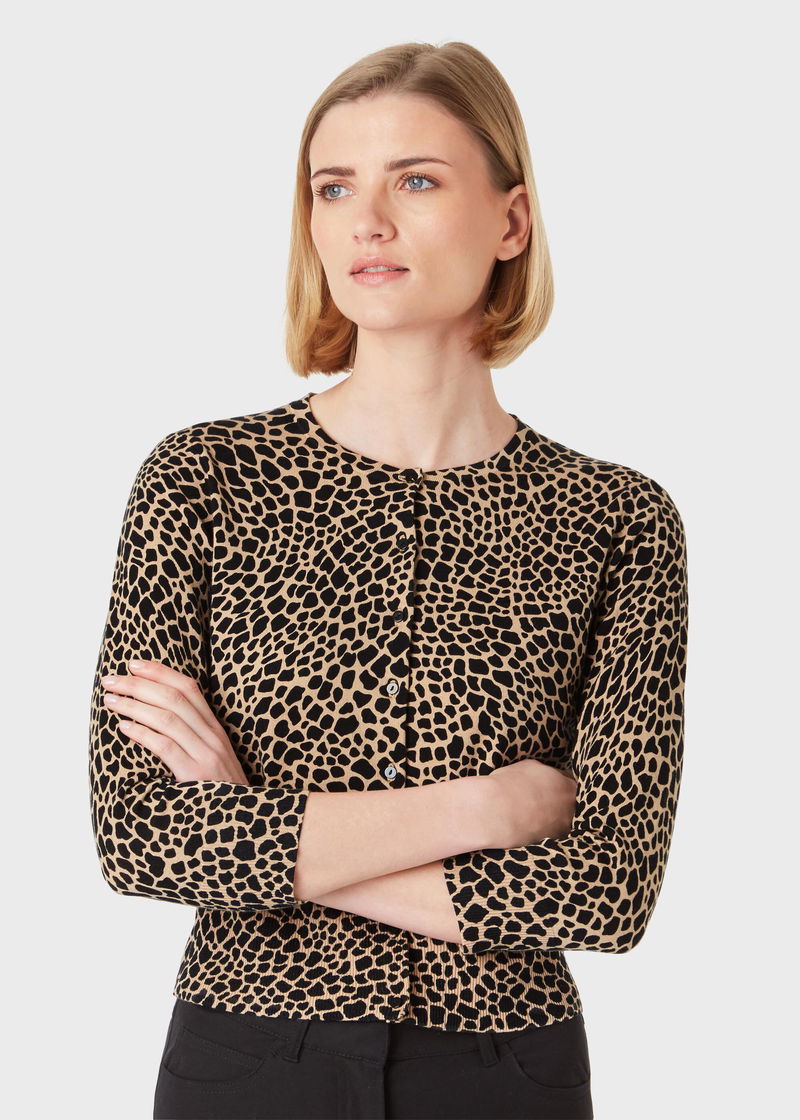 In an abstract animal print, the Paula cardigan is the perfect way to add a trend twist to your wardrobe. It's knitted to an easy crew neck silhouette with three quarter-length sleeves and ribbed trims. Wear yours for work or weekends, with jeans, skirts, or trousers. Crease resistant thanks to a touch of elastane.