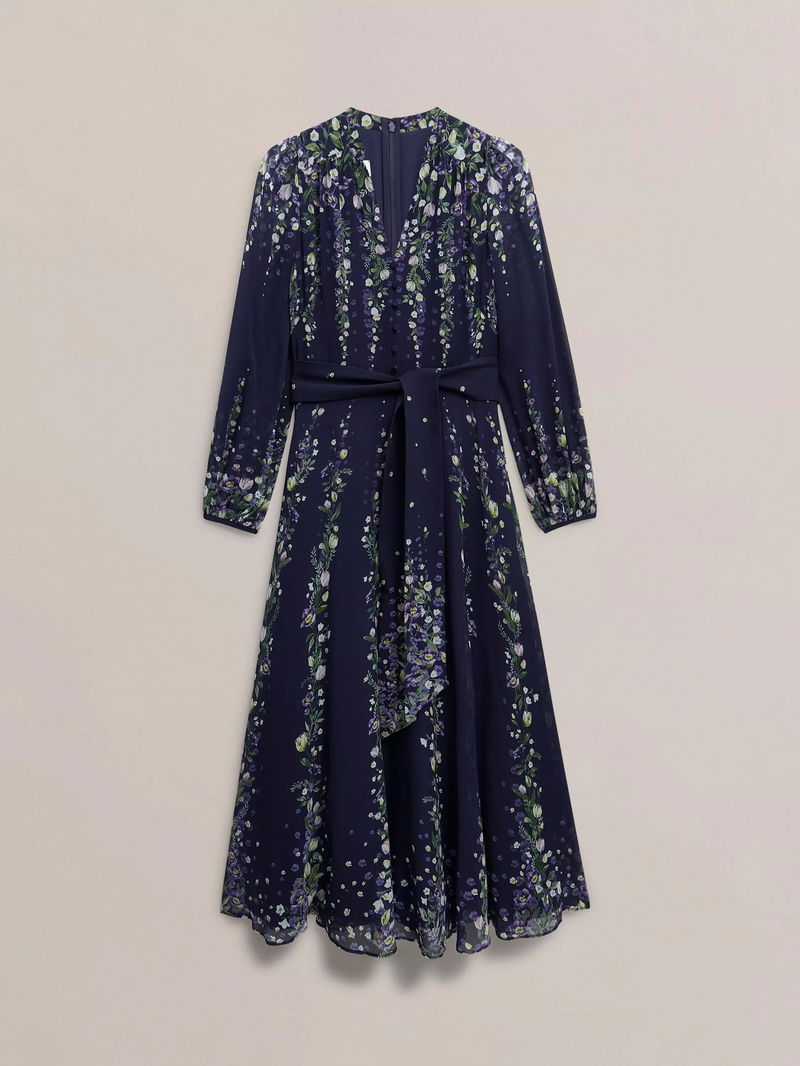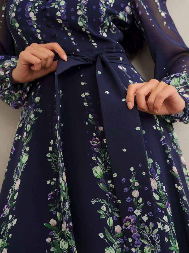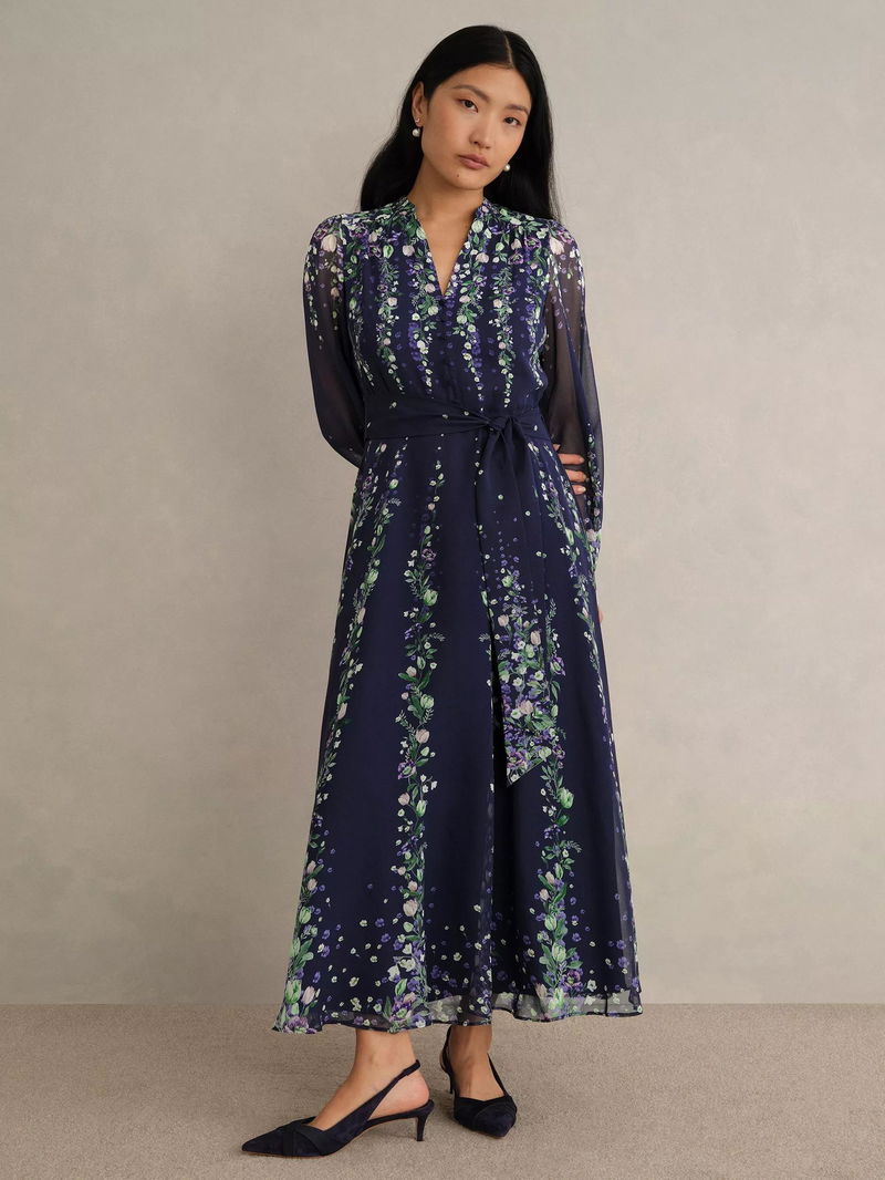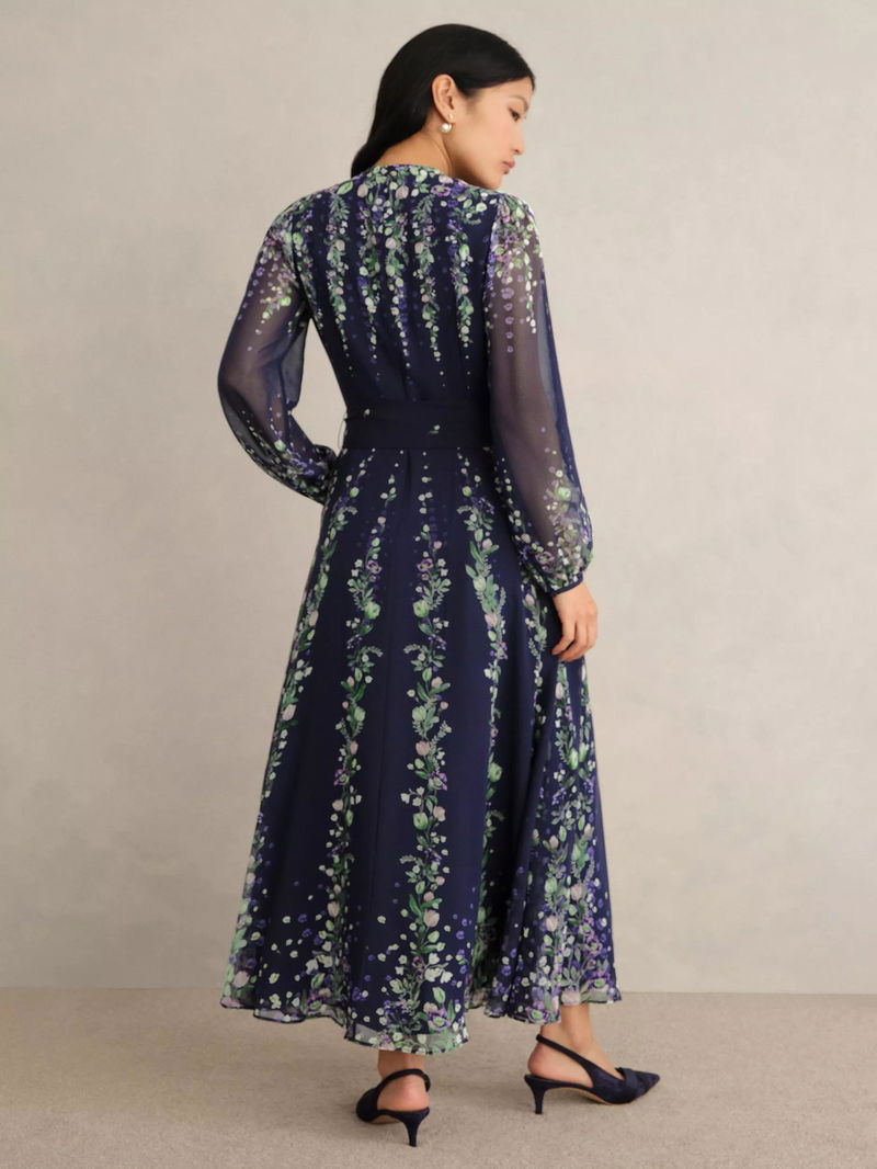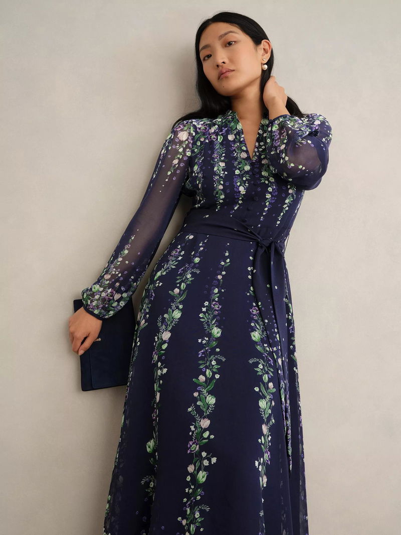 Elegantly designed with a placement floral print, embrace sophistication with the Ros silk maxi dress. Off to an opulent wedding? Just add a fascinator.