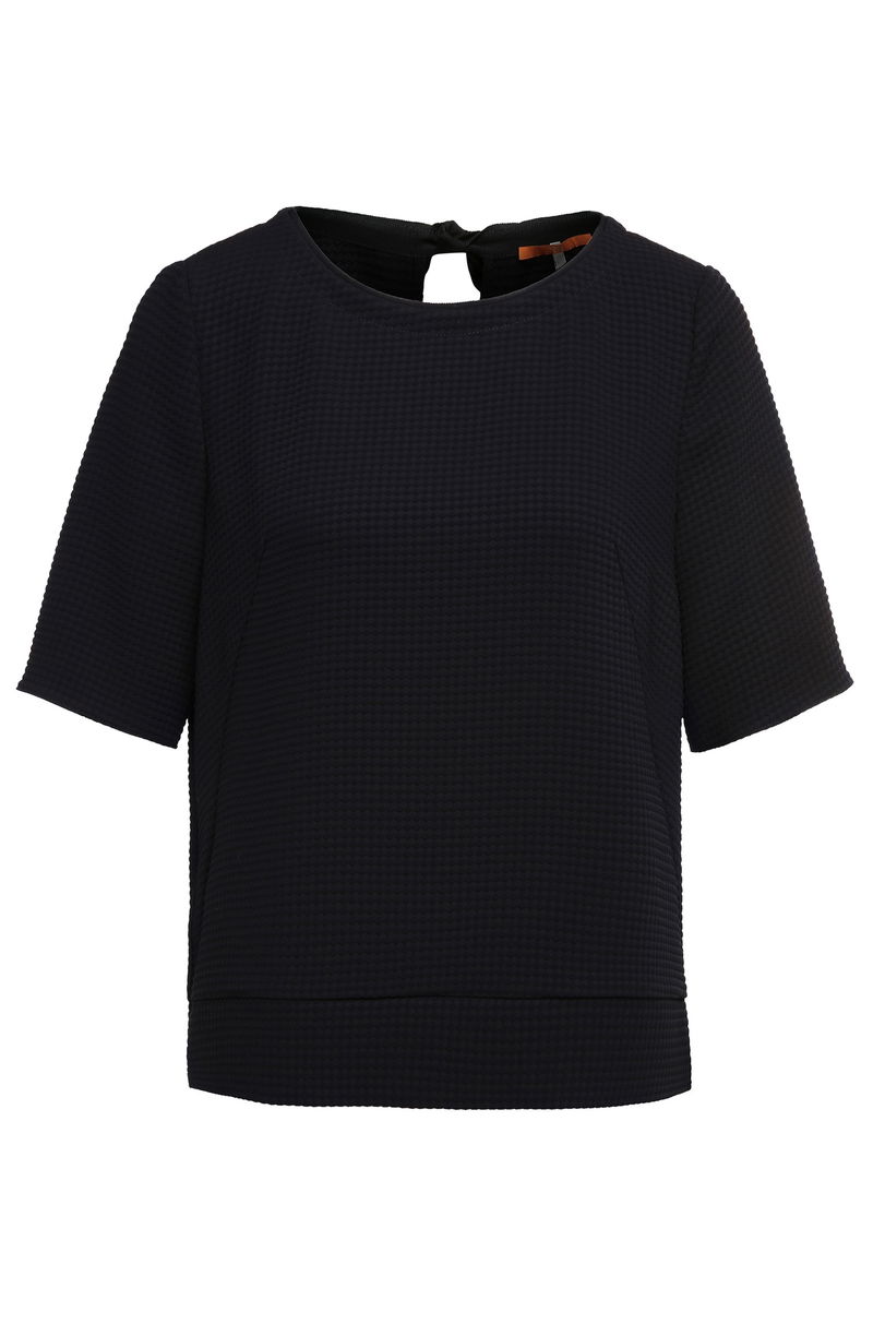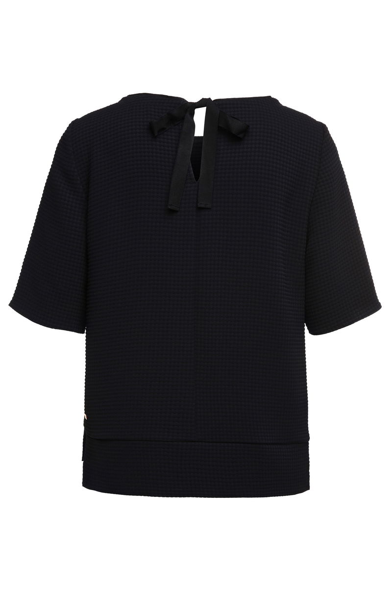 This top mixes informality with feminine style. The loose fit combines with a fabric that boasts a decorative chequerboard texture. The cut-out at the back with a corded ribbon bow and the fashionable hem give it an air of sophistication. A modern top with short sleeves suitable for any occasion.