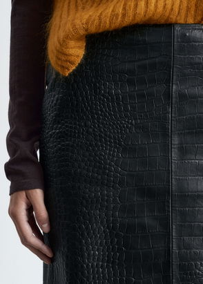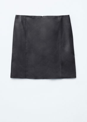 A pencil skirt crafted in nappa lambskin by BOSS Womenswear. Fully lined for enhanced comfort, this piece is detailed with subtle stitching and a high side slit for contemporary appeal. Tuck in a crisp shirt and add heeled pumps to create a formal look.
