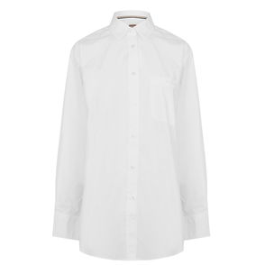 An experimental blouse by HUGO Womenswear, created in stretch cotton. Offering a laid-back silhouette, this unconventional design is styled with high-slit cuffs with metal eyelets and fabric-tape ties that can be knotted or fastened into a bow. Finished with a concealed placket and a stand collar with a metal pearl detail, this contemporary piece makes a chic statement.