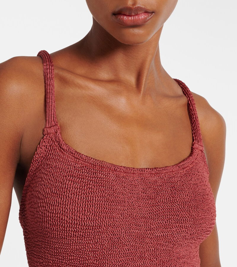 The Bette swimsuit is made using Hunza G's Seamless Crinkle Technology, making it one-size-fits-all. The piece is complete with a low-back silhouette with crisscrossed straps.