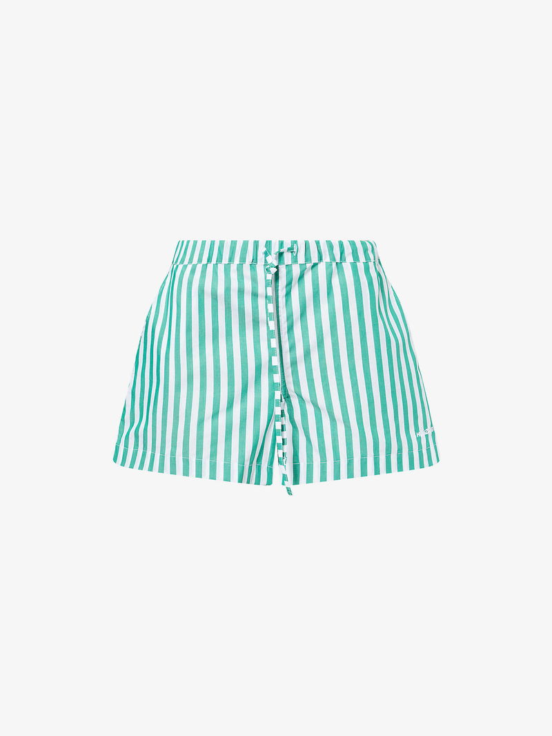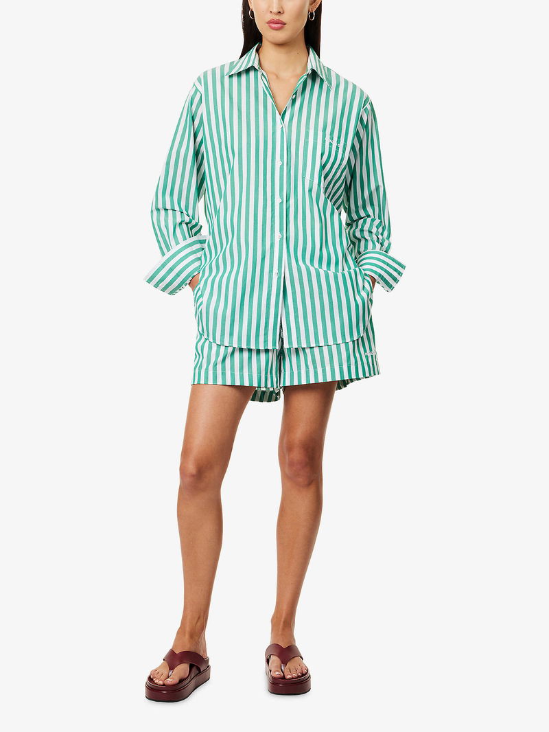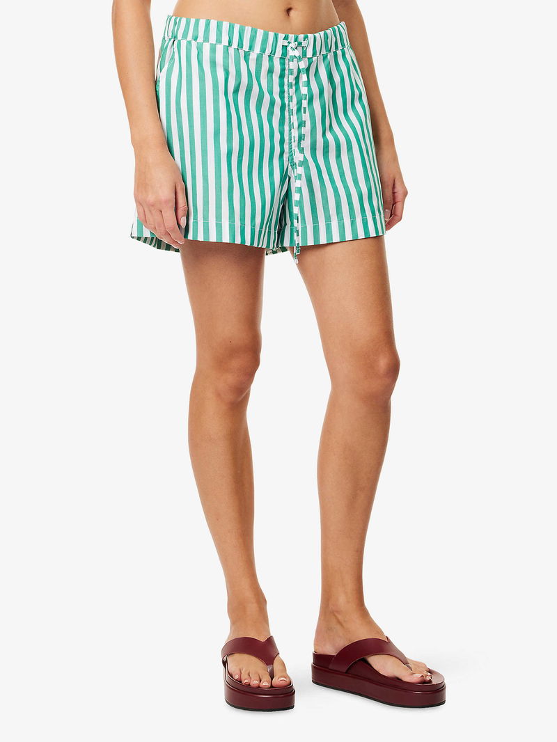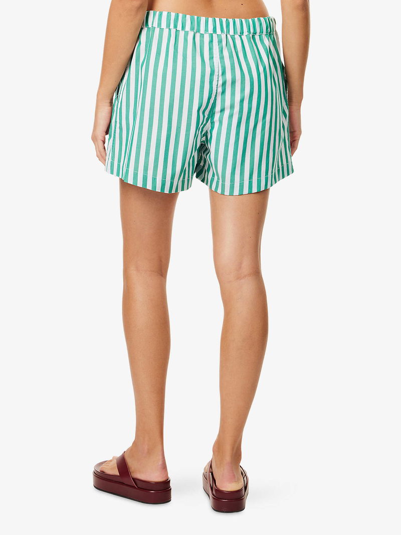 Hunza G cotton-poplin shorts. Relaxed fit, high-rise, drawstring elasticated waistband, two slip pockets and brand embroidery at front, all-over striped print, split at sides.